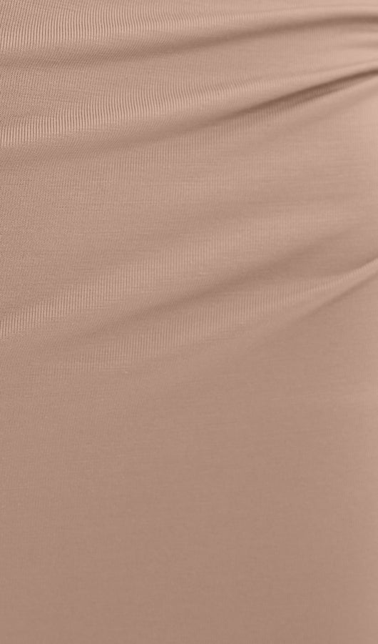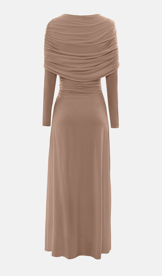 Elegant fitted maxi dress made from body-friendly monochrome jersey. The design features small gatherings in the side seam of the bodice and asymmetric draperies on the shoulders, along with fitted long sleeves and a straight floor-length skirt.