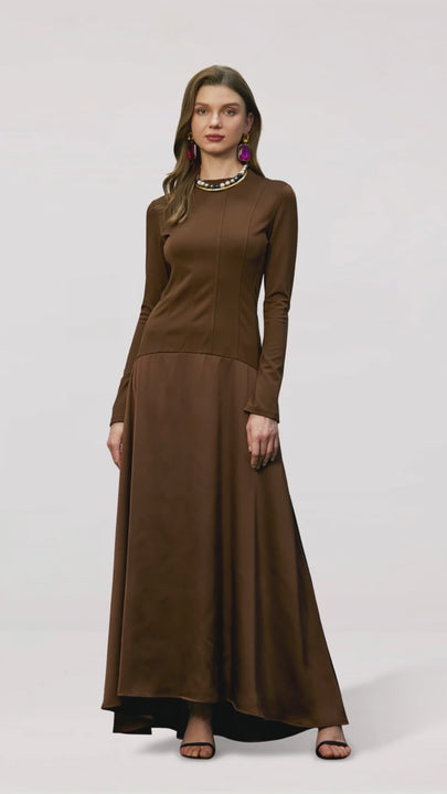 Semi-fitted jersey maxi dress with a round neckline and straight long sleeves, and a light flared skirt.