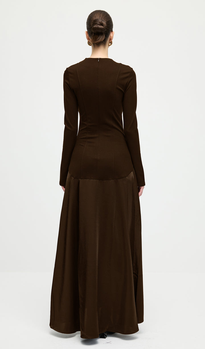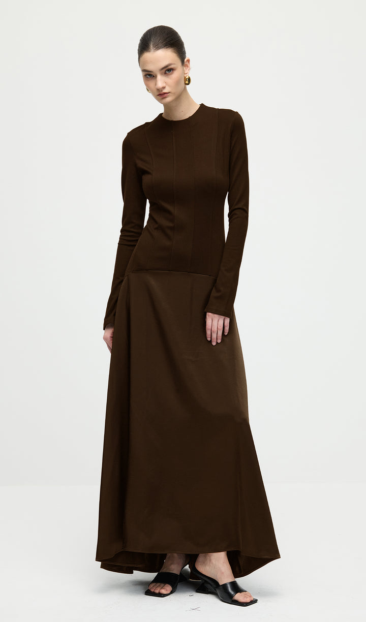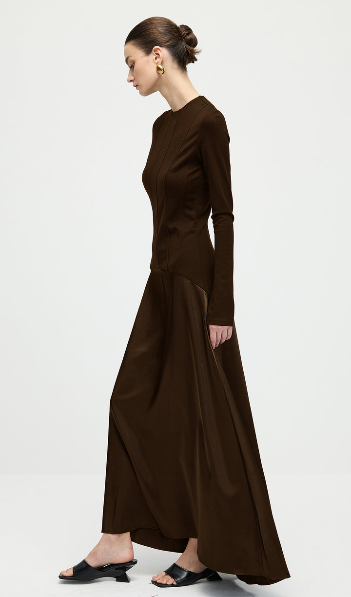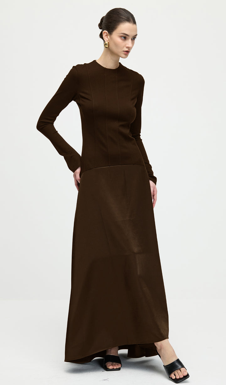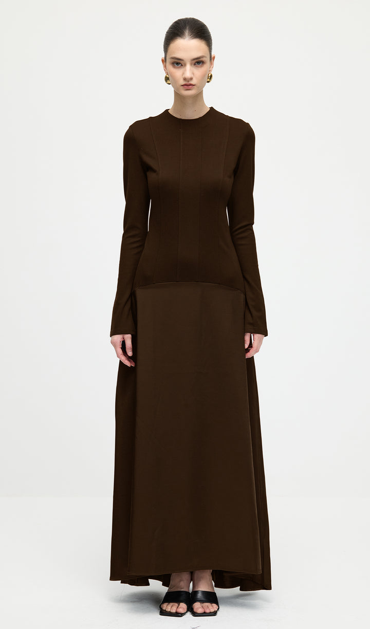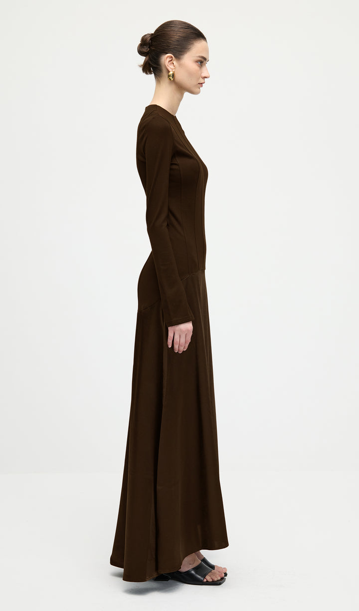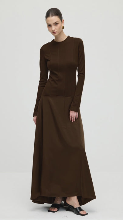 Semi-fitted jersey maxi dress with a round neckline and straight long sleeves, and a light flared skirt.