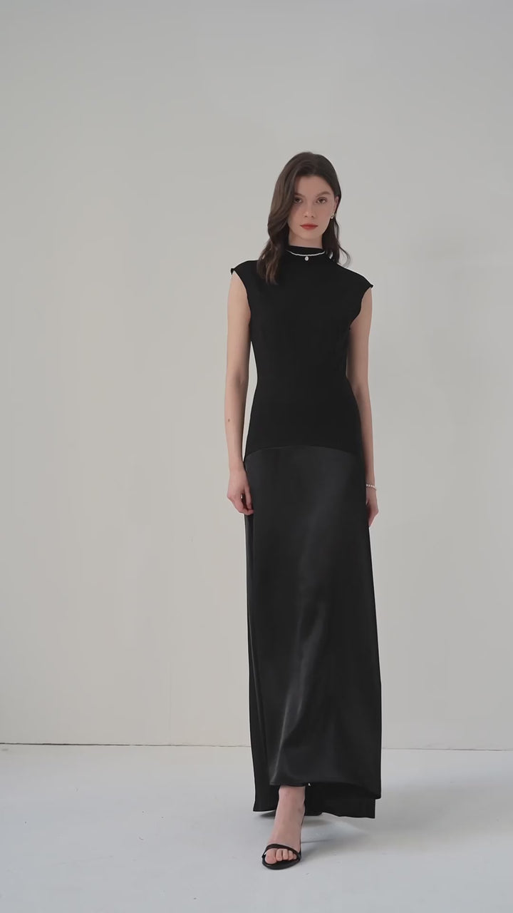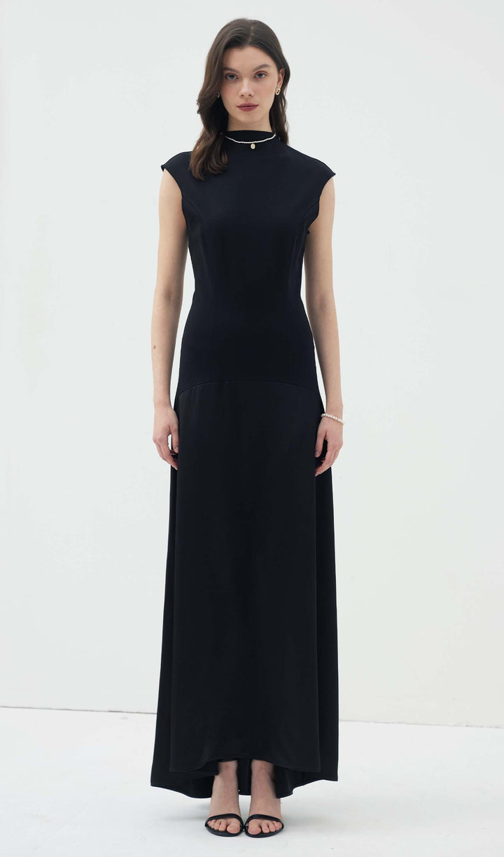 Semi-fitted jersey maxi dress with a round neckline and straight long sleeves, and a light flared skirt.