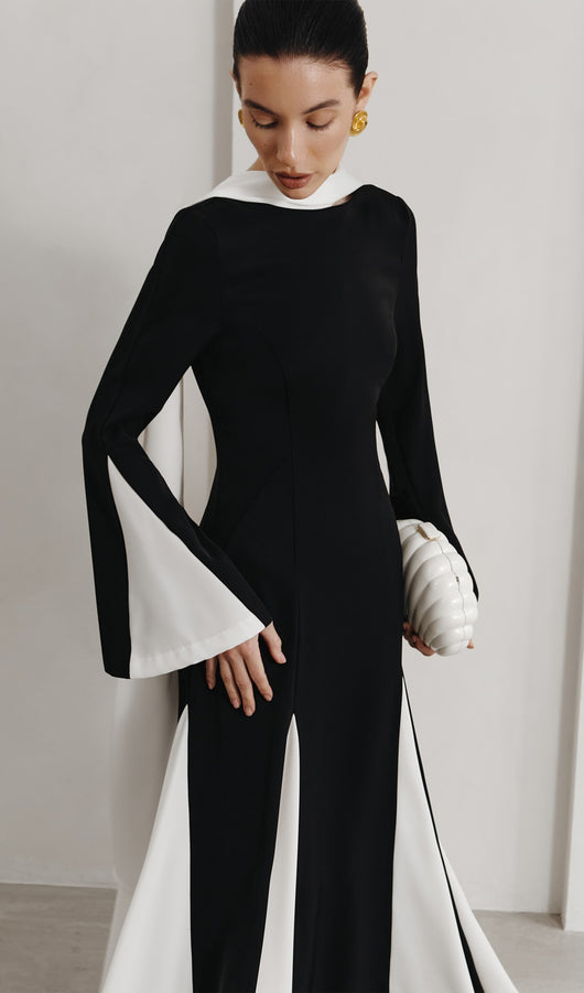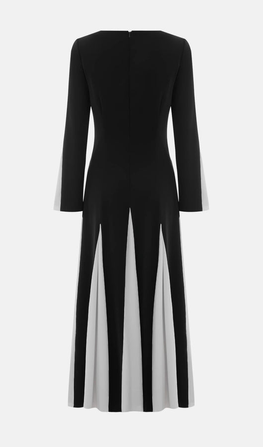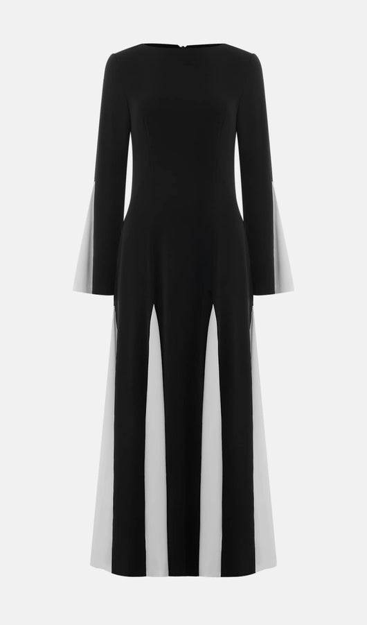 Sophisticated semi-fitted maxi dress with oval neckline, flared sleeves and flowing skirt, made from smooth jersey and completed with contrasting triangular inserts.