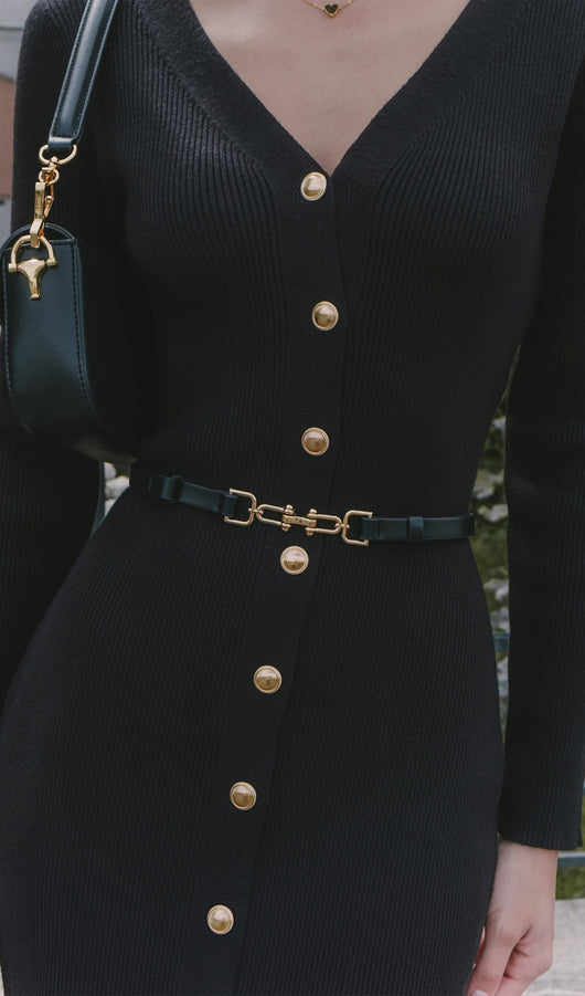 Alluring midi dress with a fitted silhouette, deep V-neckline and large golden buttons at the front. The dress is made of stretch knitted jersey and comes with a slim eco-leather belt with accent detailing.