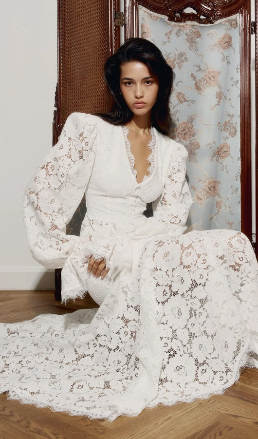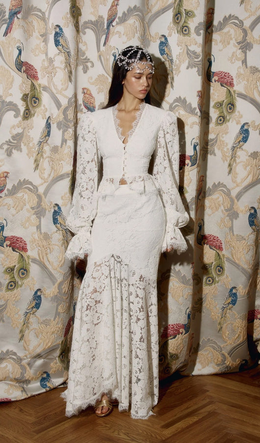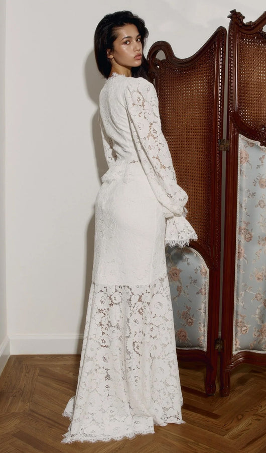 Lace Trimmed Puff Sleeved Top & Fishtail Skirt Set