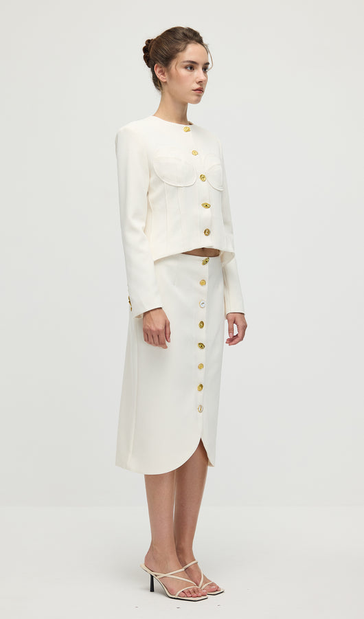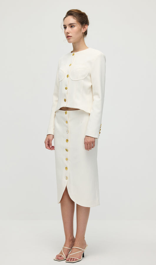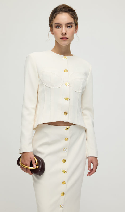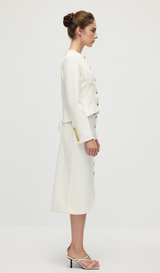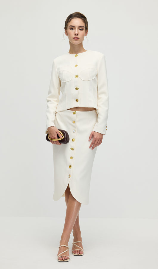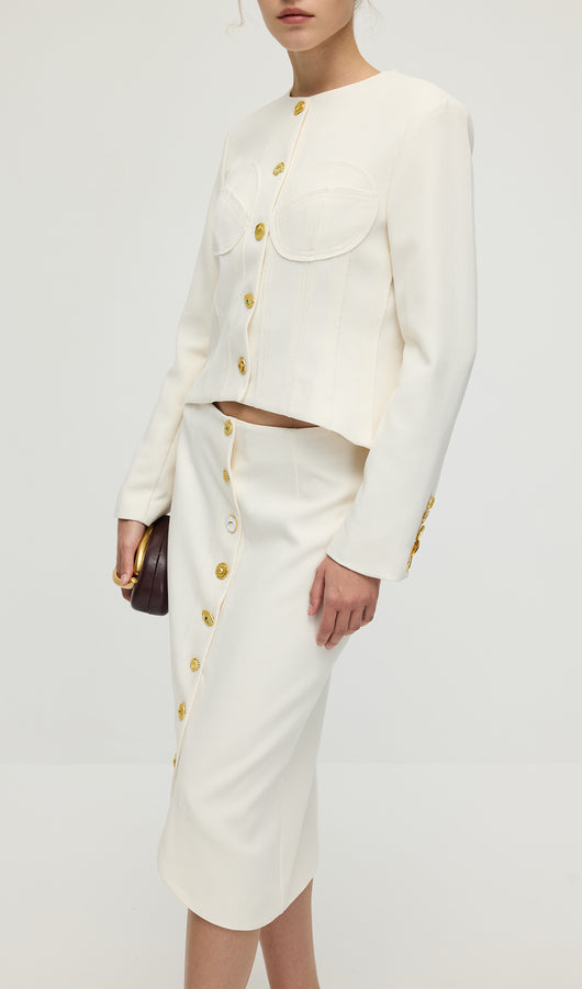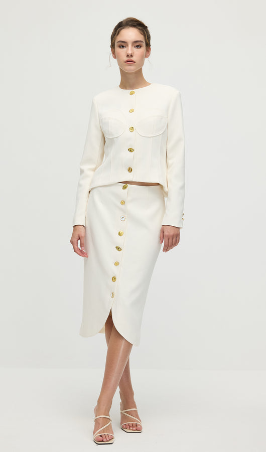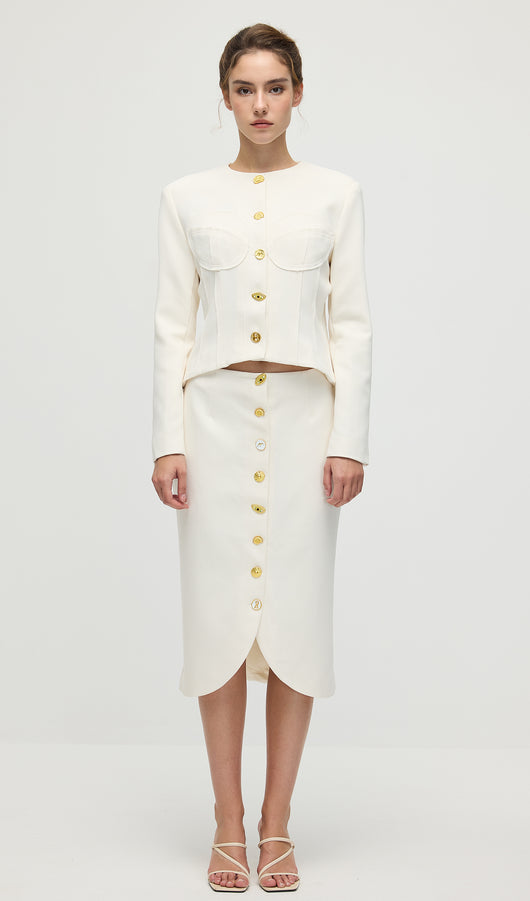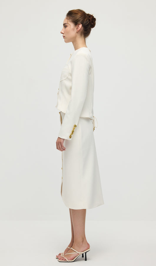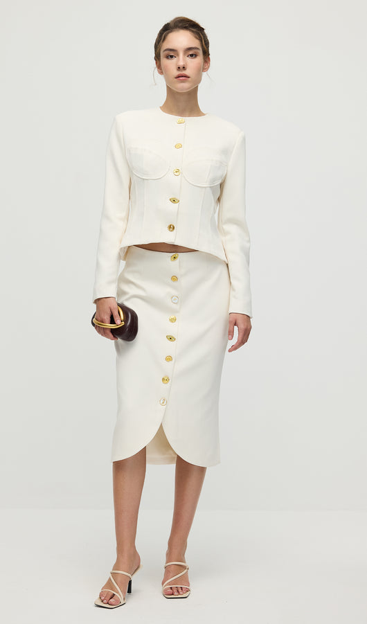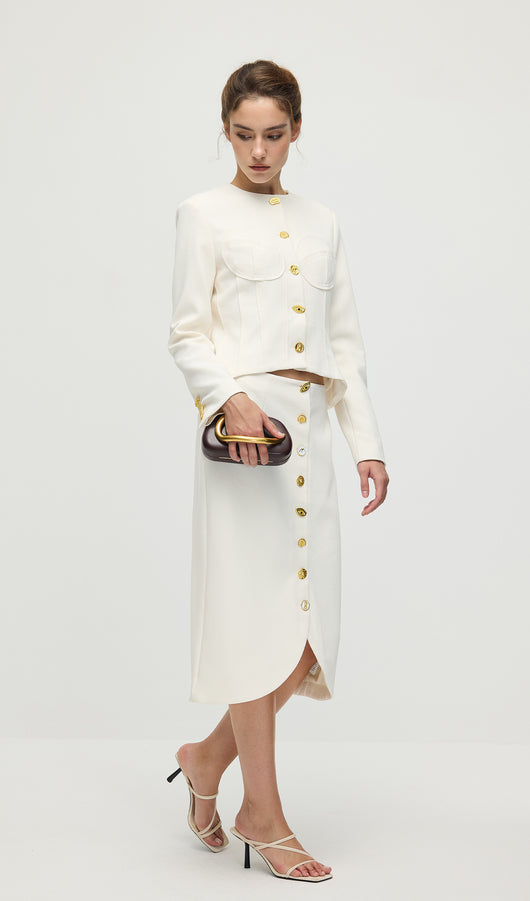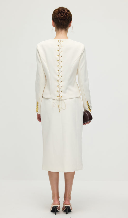 This Long Sleeved Back Tie Two-Piece Set offers a sophisticated blend of style and comfort. Featuring a sleek, fitted top with long sleeves and an adjustable back tie, it allows a tailored fit that enhances silhouette definition. The matching skirt completes the ensemble with clean lines and a minimalist aesthetic, making it versatile for both formal occasions and elegant casual wear. Crafted to maintain a crisp white hue, this set provides a refined and polished look suitable for those seeking modern elegance with practical ease.