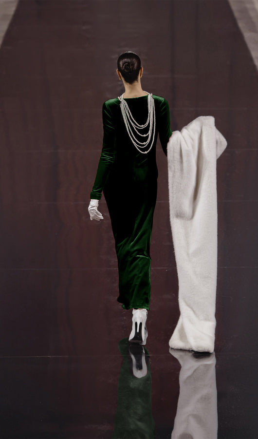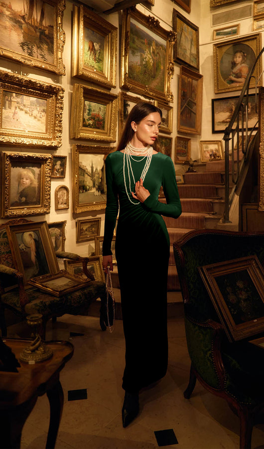 Demure fitted maxi dress with oval neckline, long sleeves and flowing flared floor-length skirt. The dress is made from smooth monochrome fabric and has diagonal stitching at the front, complemented by small asymmetric gathers.