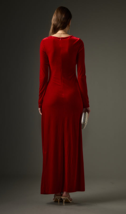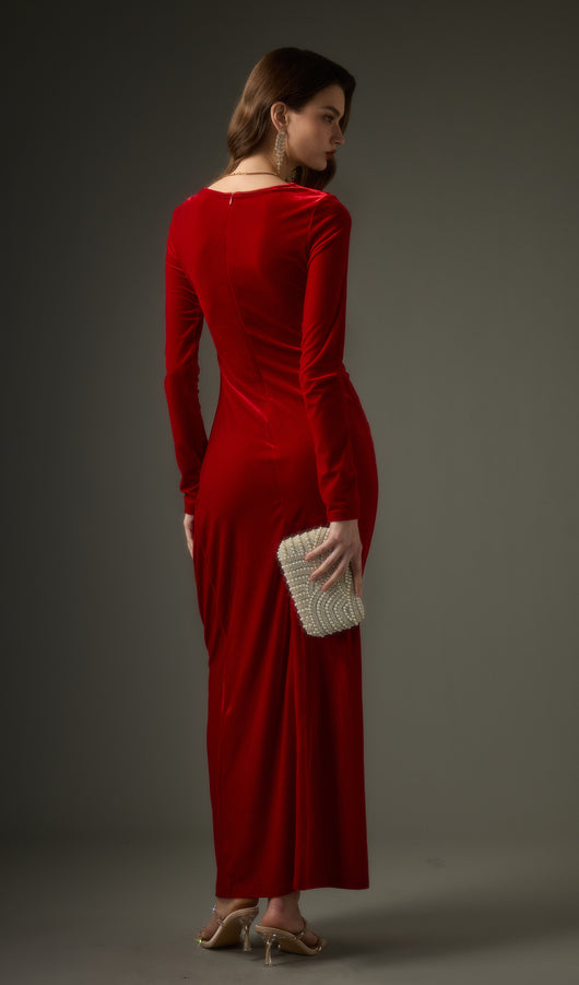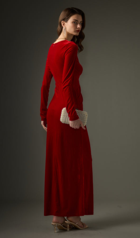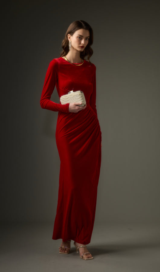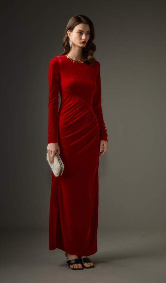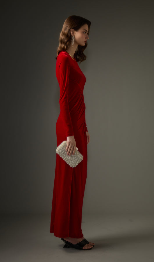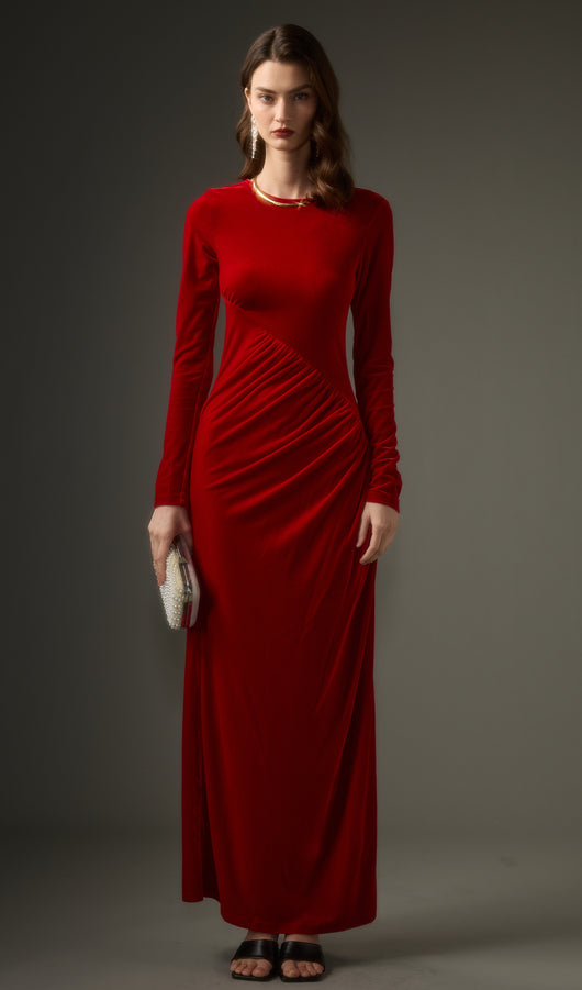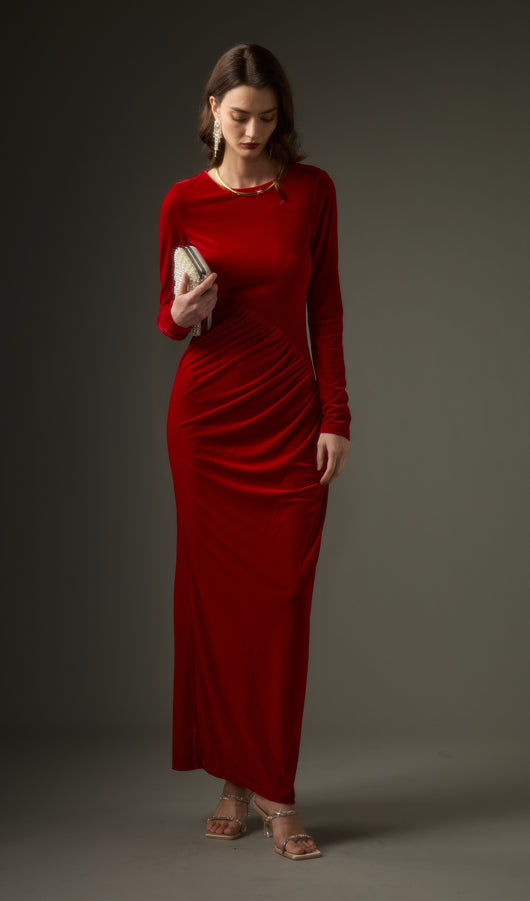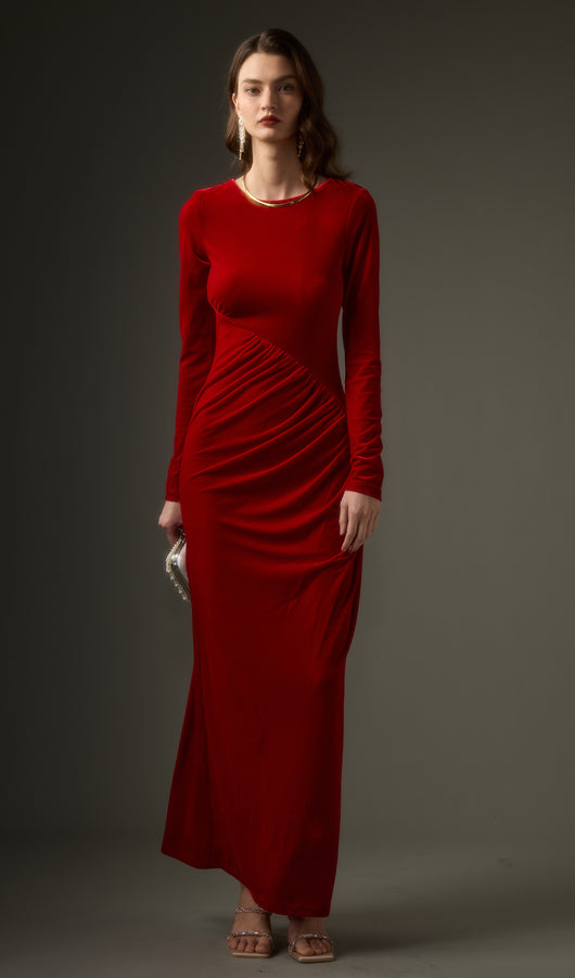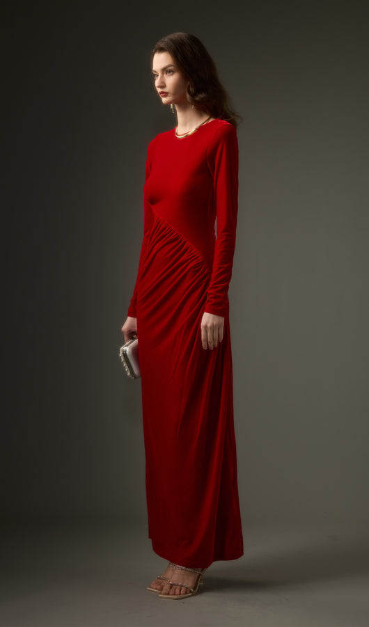 Demure fitted maxi dress with oval neckline, long sleeves and flowing flared floor-length skirt. The dress is made from smooth monochrome fabric and has diagonal stitching at the front, complemented by small asymmetric gathers.