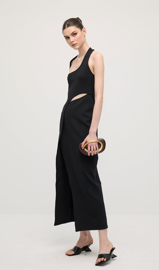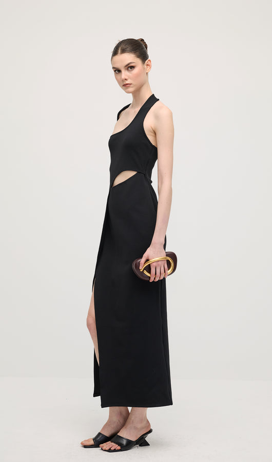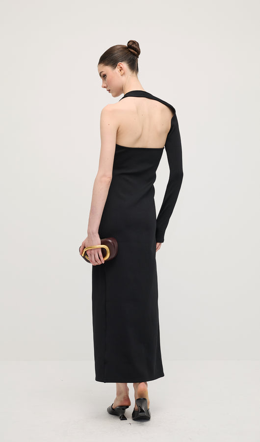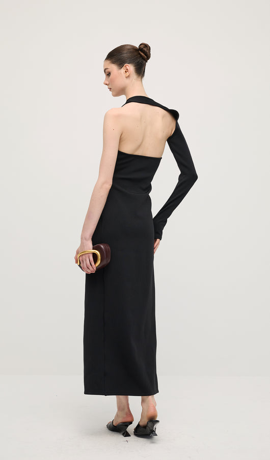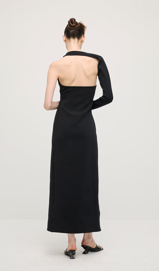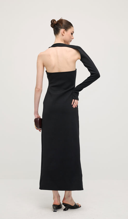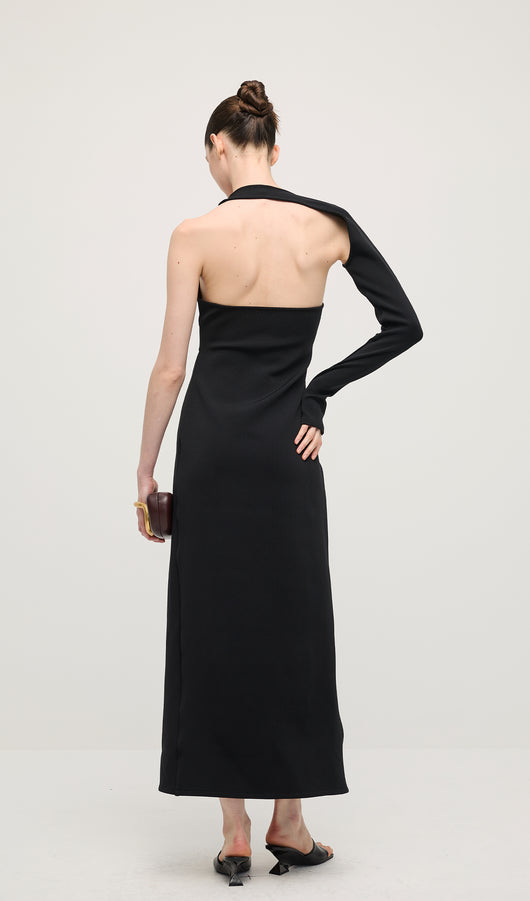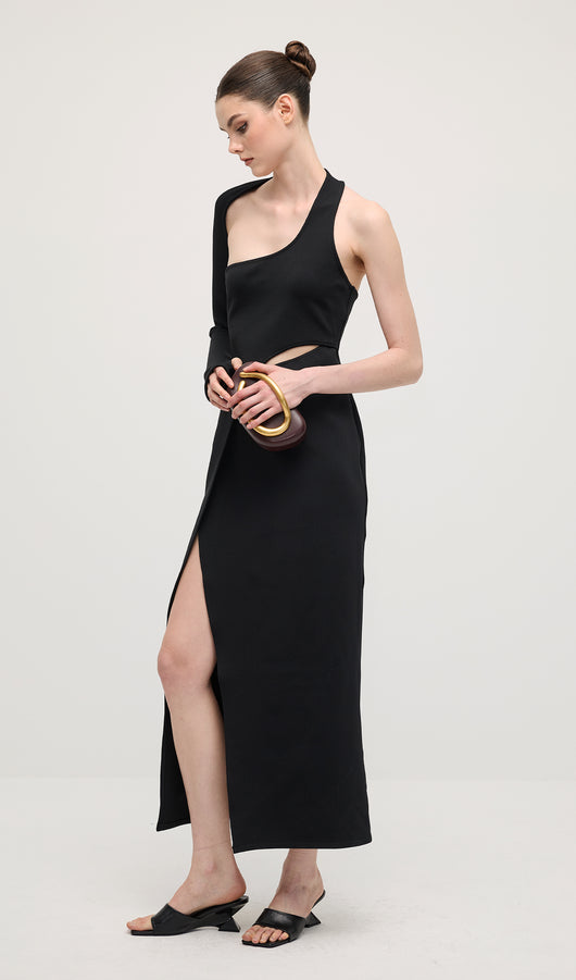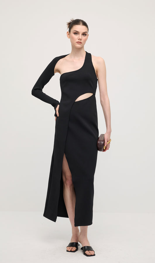 The midweight knit fabrication creates a body-sculpting fit, while its asymmetrical neckline, single sleeve and waist cut-out detail imbue this piece with sophisticated allure.