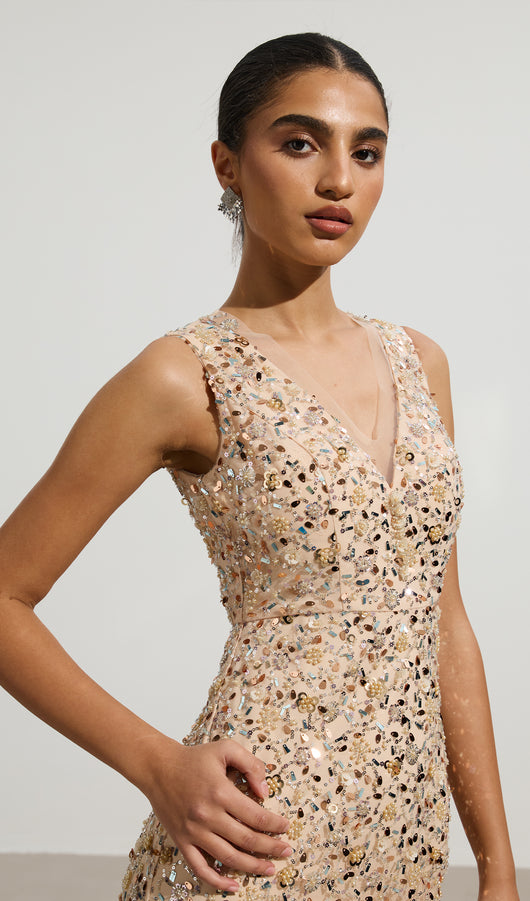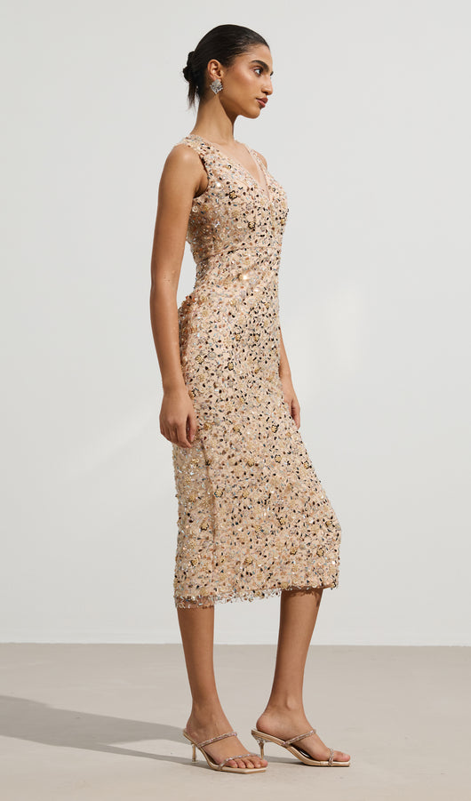 The Marita Embellished V Neck Midi Dress combines sophisticated elegance with refined detailing. This midi-length piece features a flattering V neckline and intricate embellishments that elevate any occasion. The thoughtfully designed silhouette offers both comfort and polish, making it an ideal choice for evening events, celebrations, or upscale gatherings. The embellished accents catch light beautifully, adding dimension and visual interest to your ensemble. Perfect for those seeking a dress that balances timeless style with contemporary flair.