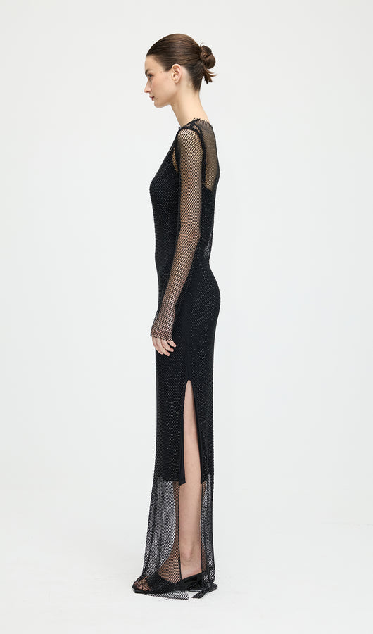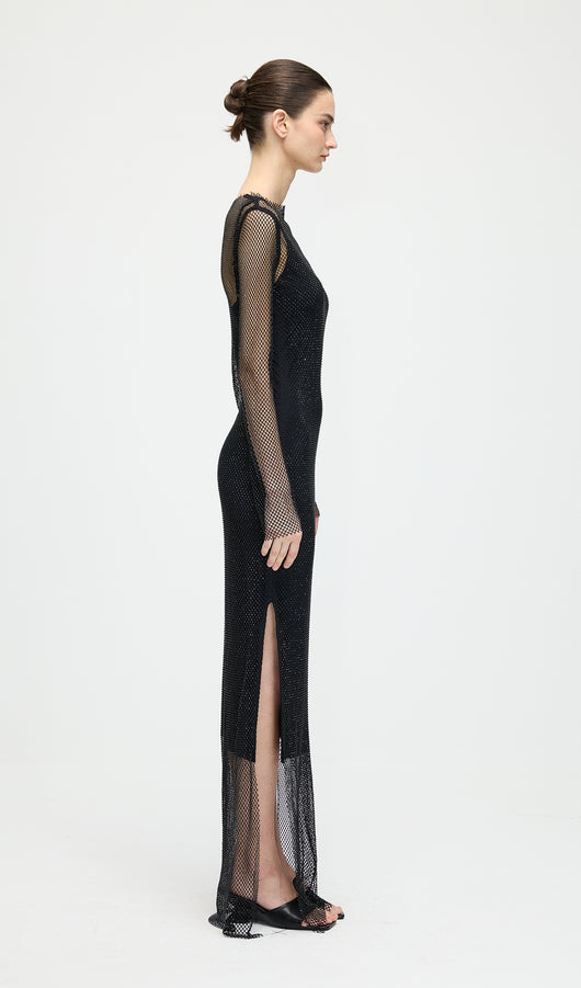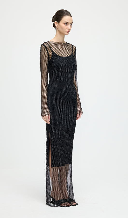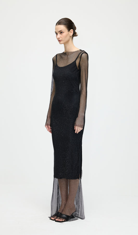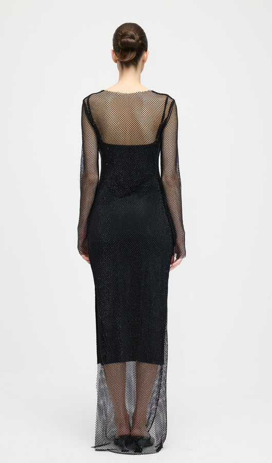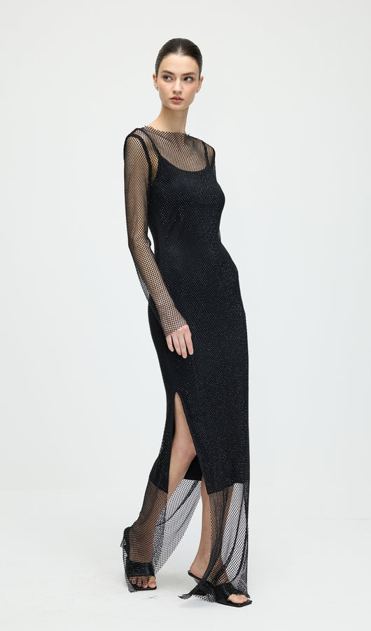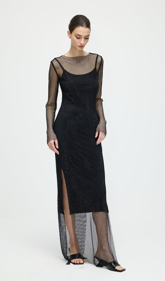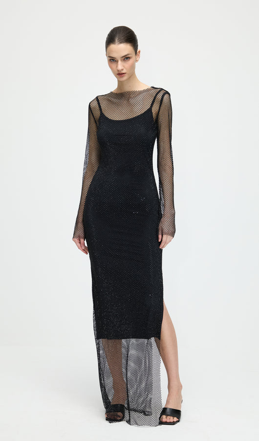 Bold layered maxi dress of an original design with a round neckline, straight sleeves and a skirt with a high side slit. The dress is made from elastic material with large grid and has a dense opaque lining.
