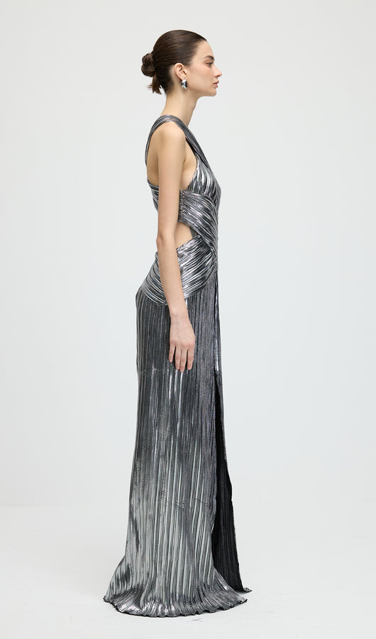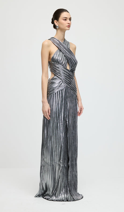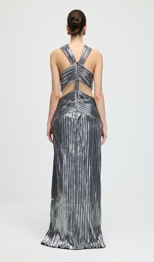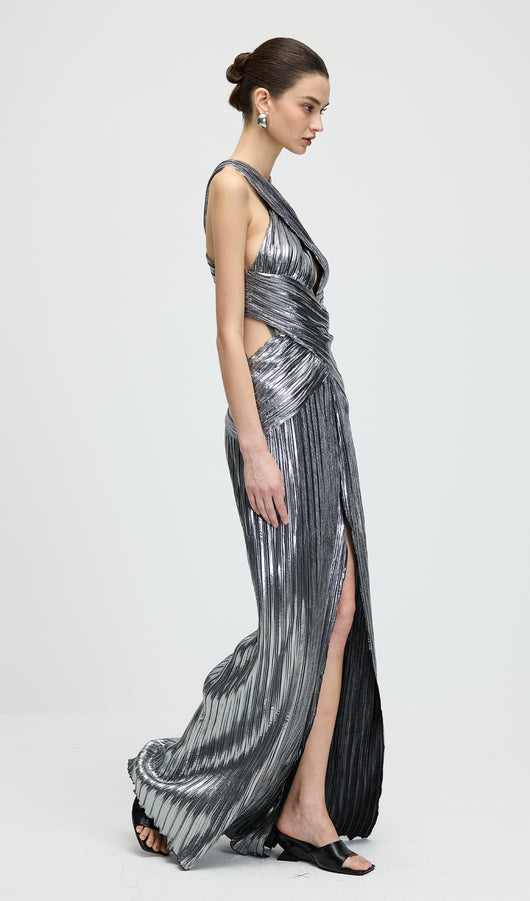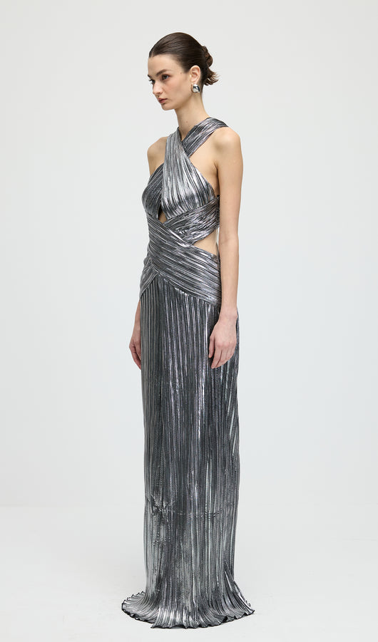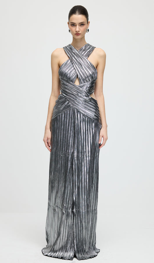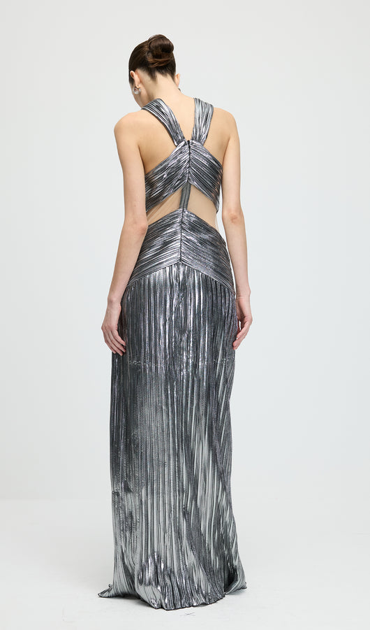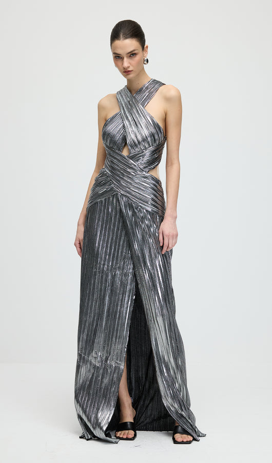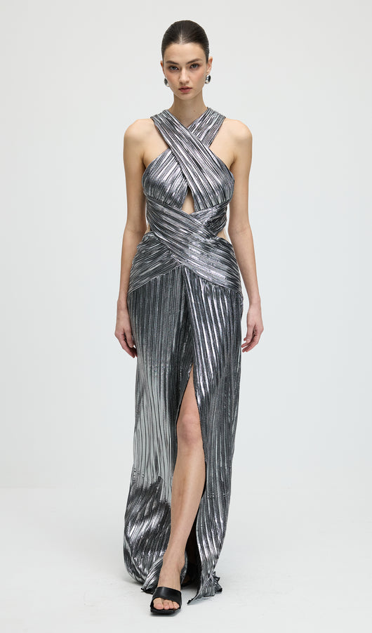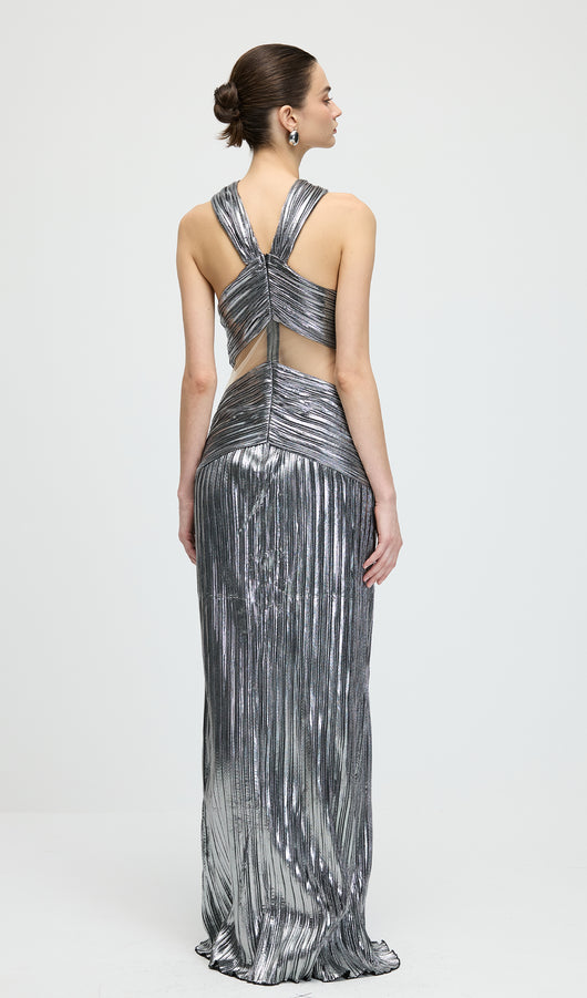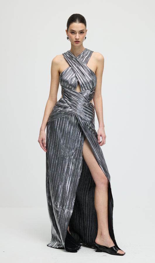 Metallic Halter Slit Maxi Dress