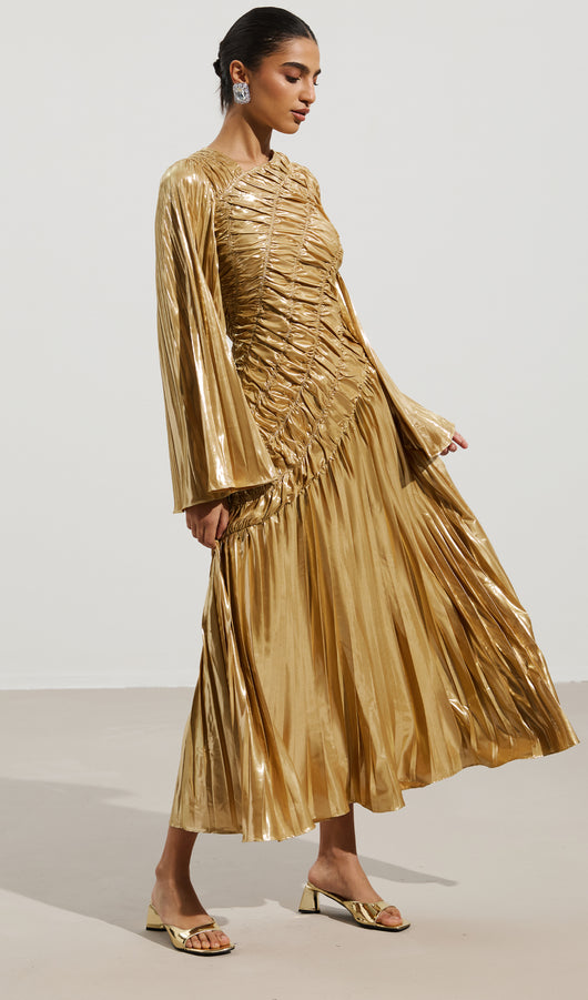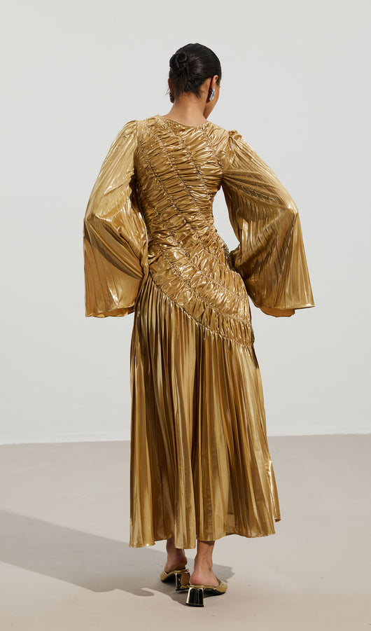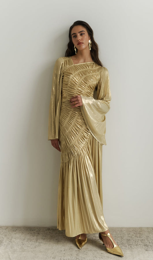 A stunning maxi dress with an asymmetrical neckline, long wide sleeves, and a flowy skirt. The model is made of metallic fabric.Soft with subtle pleats and finished with wavy elastic gathers on the front chest.