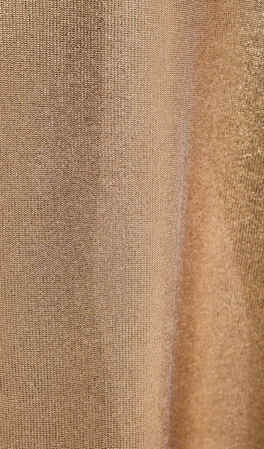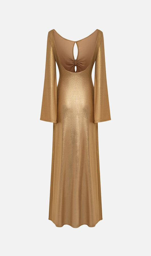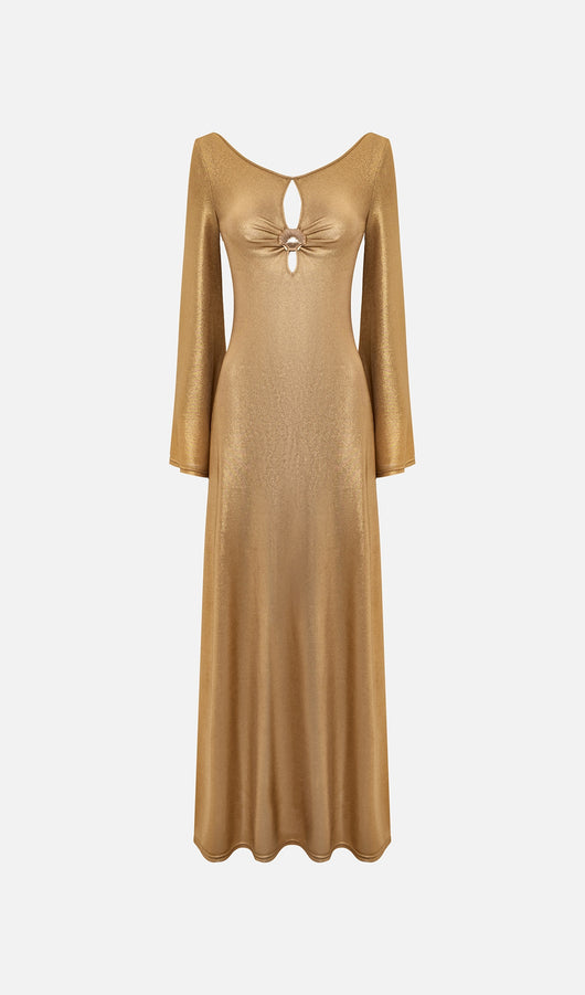 Exquisite fitted maxi dress made from stretch jersey with metallic shine. The model features a spectacular vertical slit on the bodice, decorated with a golden metallic element, along with flared long sleeves and a floor-length skirt with a tight fit on the hips.