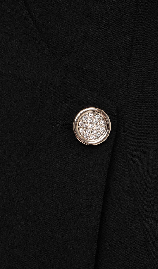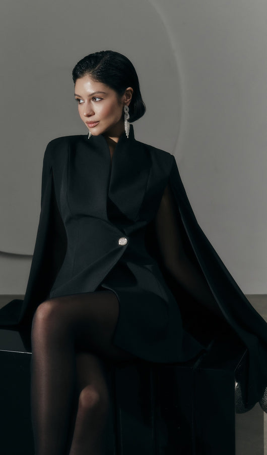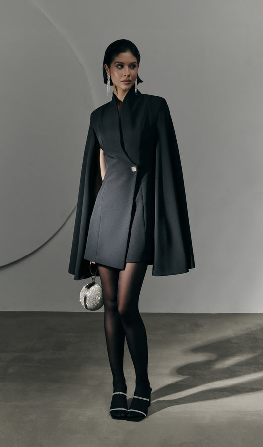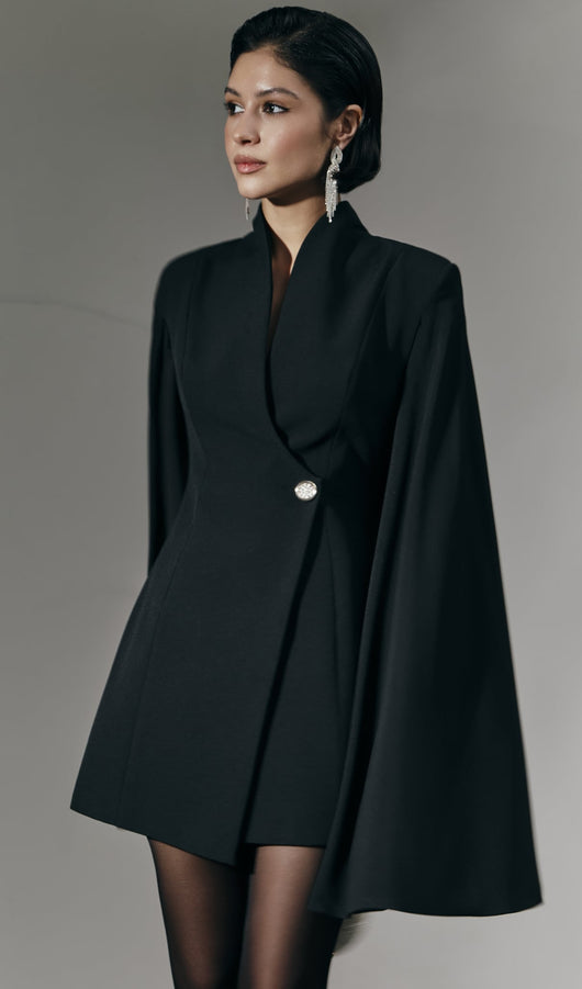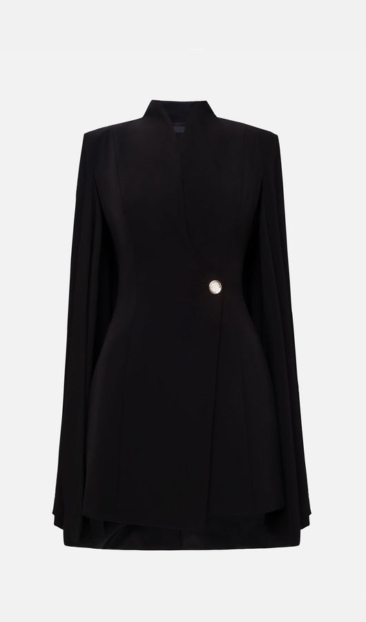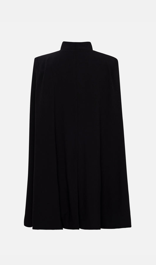 A discreet, fitted mini dress with a high stand-up collar, a flared skirt, and a large button closure at the front. Crafted from a heavy suiting fabric, this dress features accentuated loose sleeves.