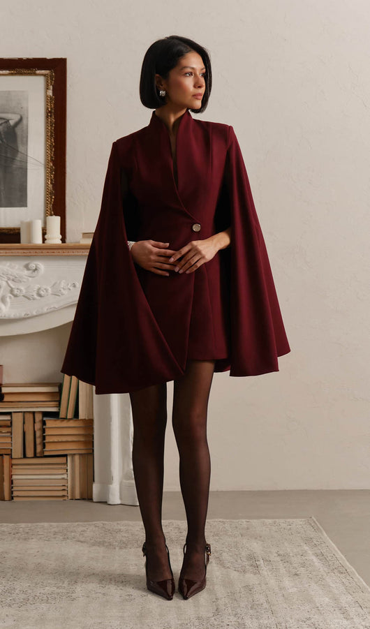 A discreet, fitted mini dress with a high stand-up collar, a flared skirt, and a large button closure at the front. Crafted from a heavy suiting fabric, this dress features accentuated loose sleeves.