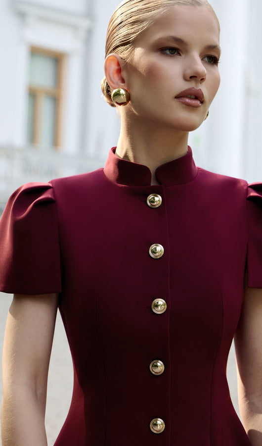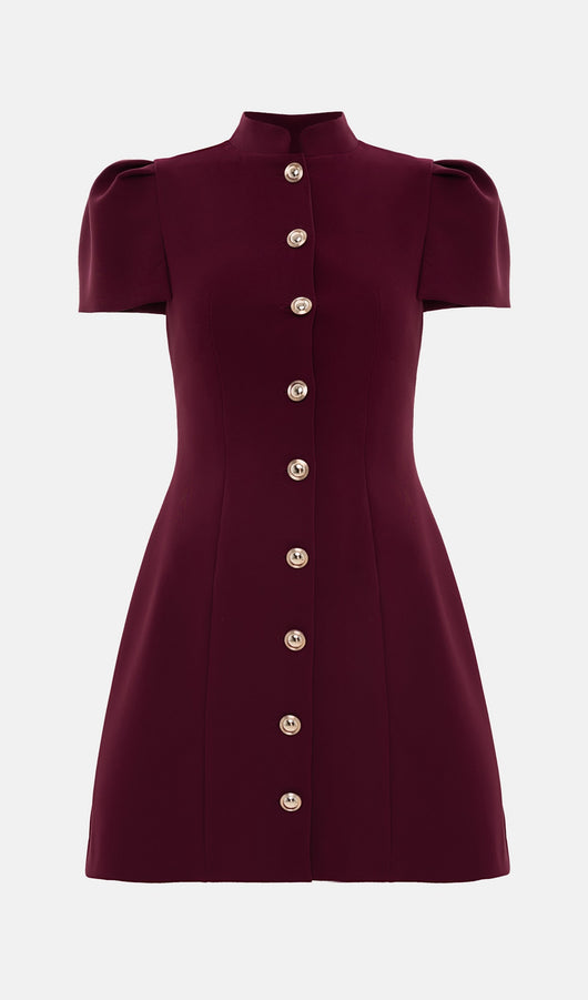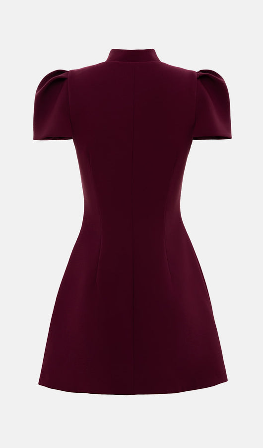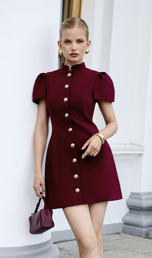 Elegant fitted mini dress made from dense monochrome fabric. The model features a high stand-up collar, voluminous short sleeves with large pleats on the shoulders and fastening with accent metal buttons at the front.