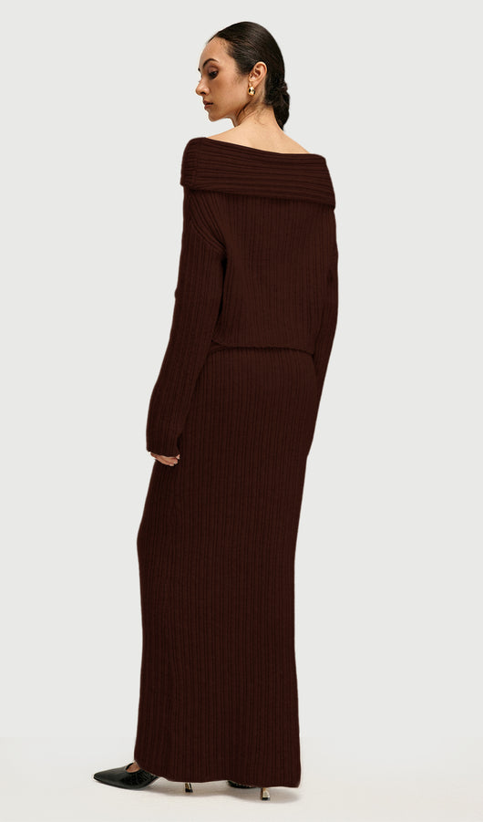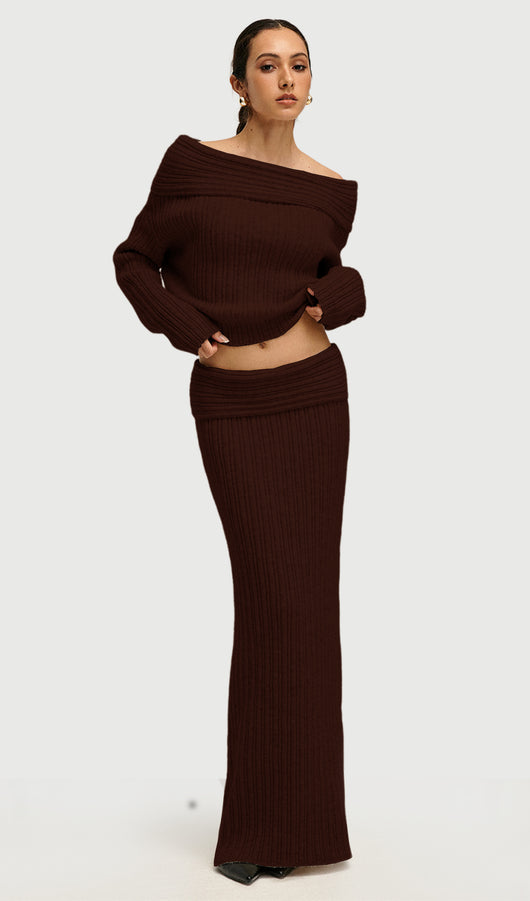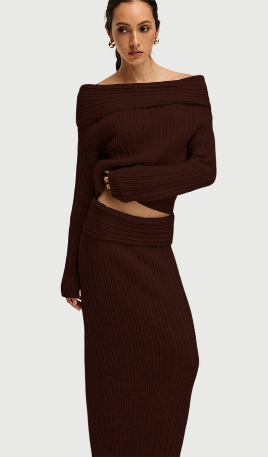 Off Shoulder Knitted Two Piece Set In Coffee