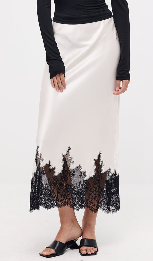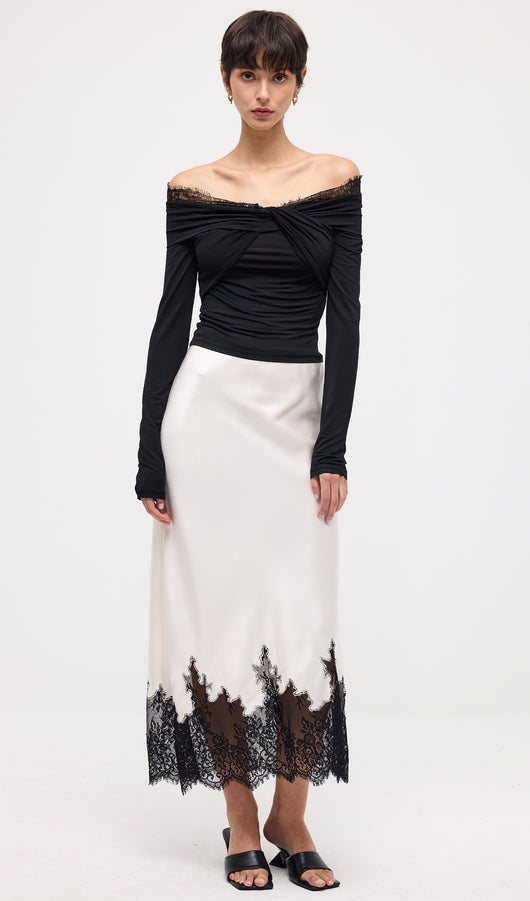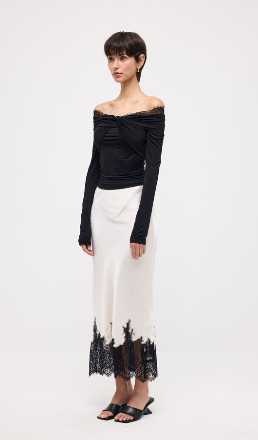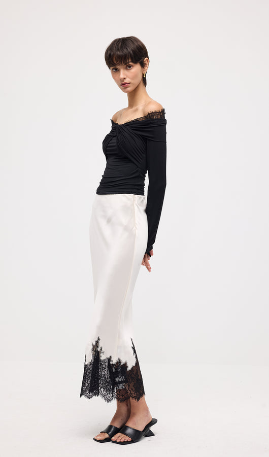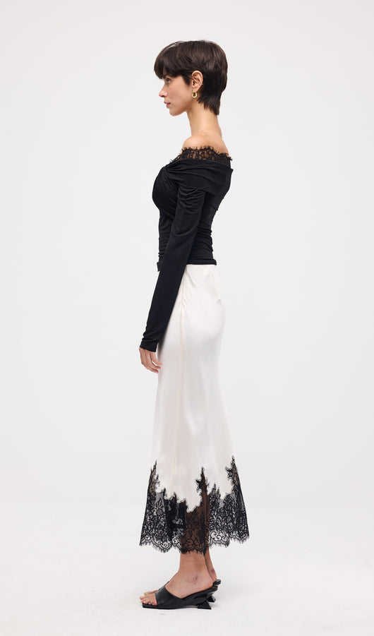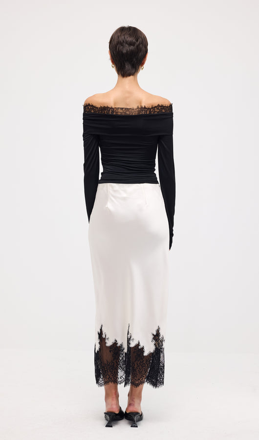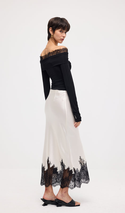 This elegant ensemble pairs a delicate off-shoulder lace top with a smooth satin skirt, combining texture and sheen for a refined look. The lace top offers subtle femininity and breathability, while the satin skirt adds fluidity and a polished finish. Ideal for formal occasions, this set enhances your silhouette with its structured yet soft design, delivering sophistication with comfort.
