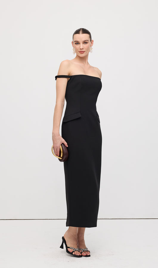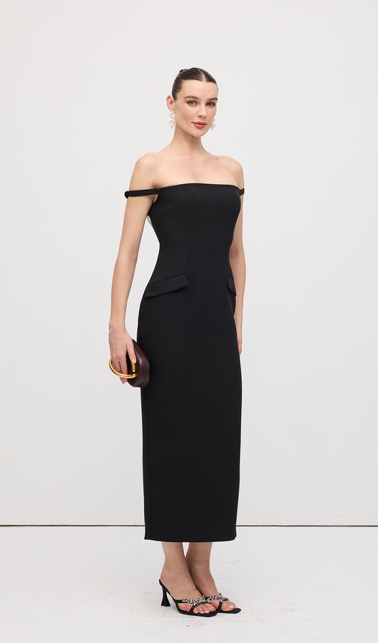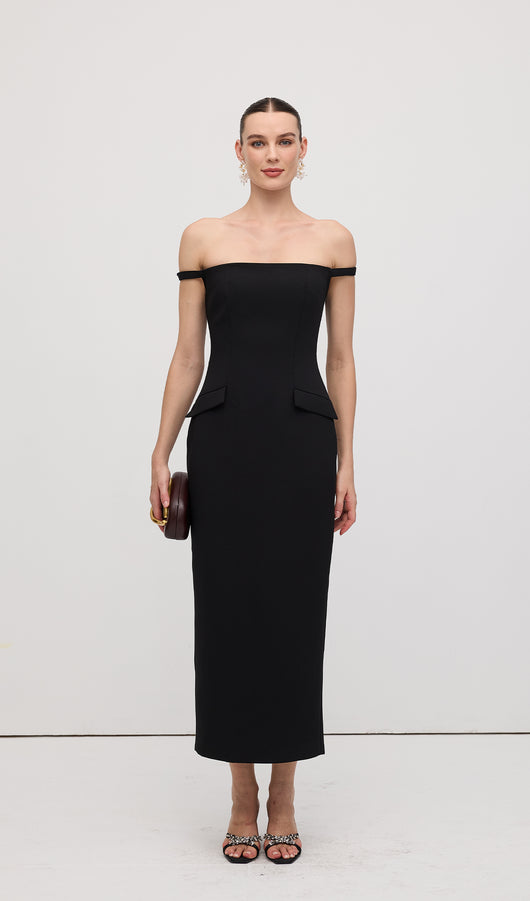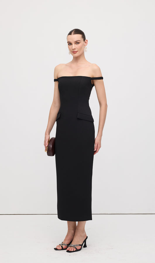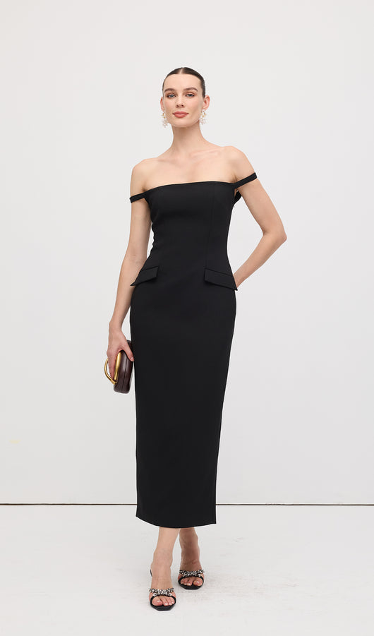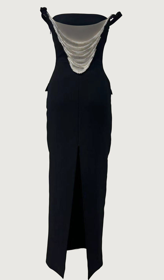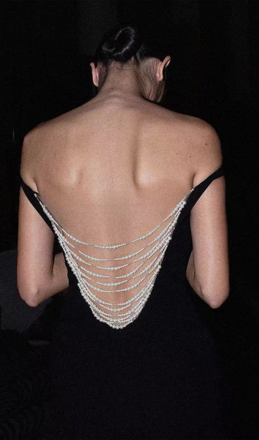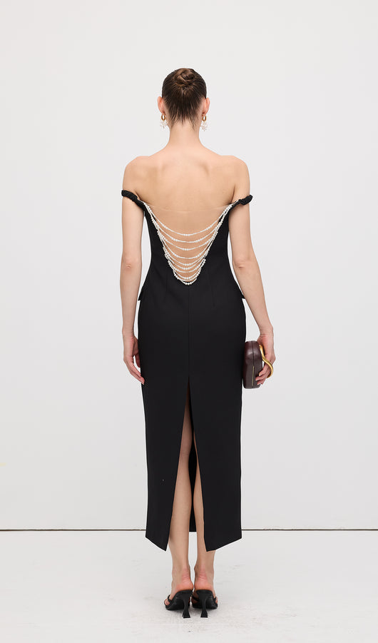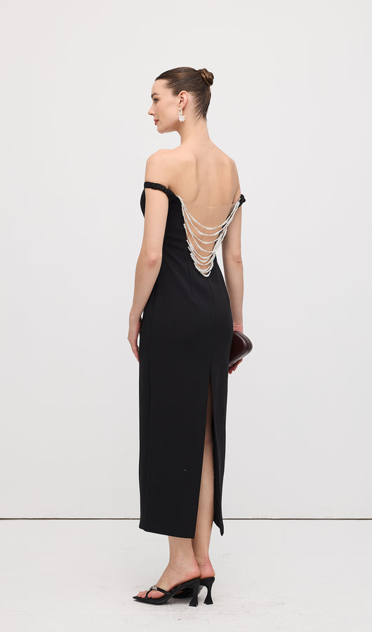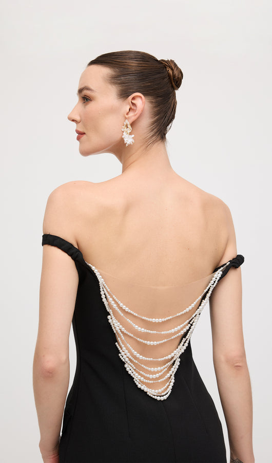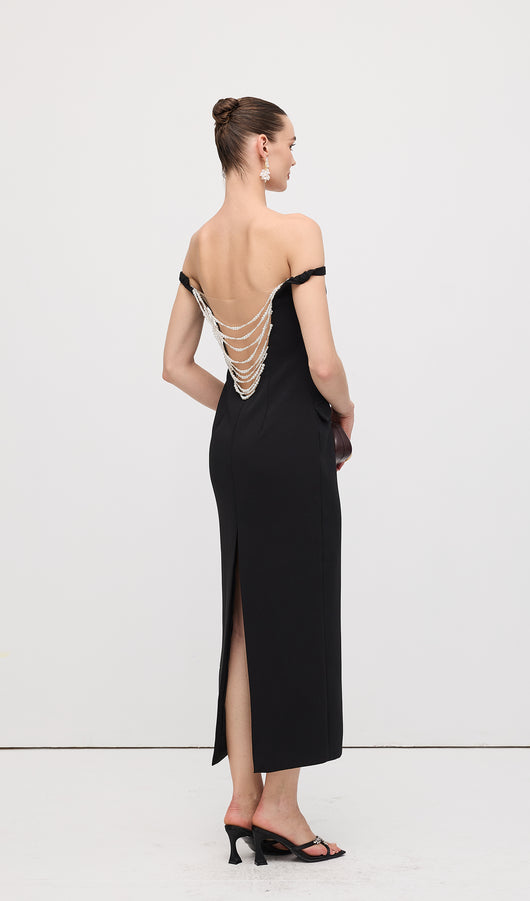 Off shoulder silhouette with a split back for ease of movement, peral decroted ,featuring delicate ruching through the hips and body for the most flattering drape on the body.