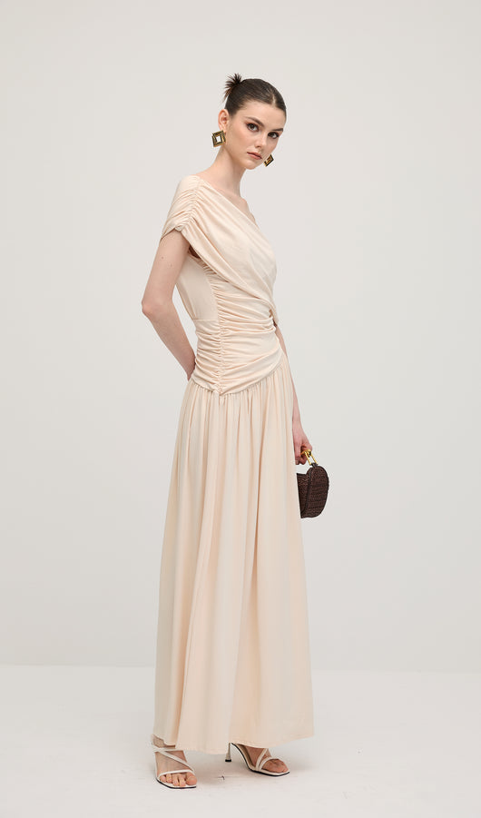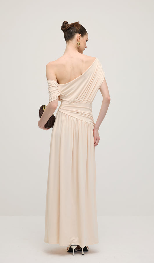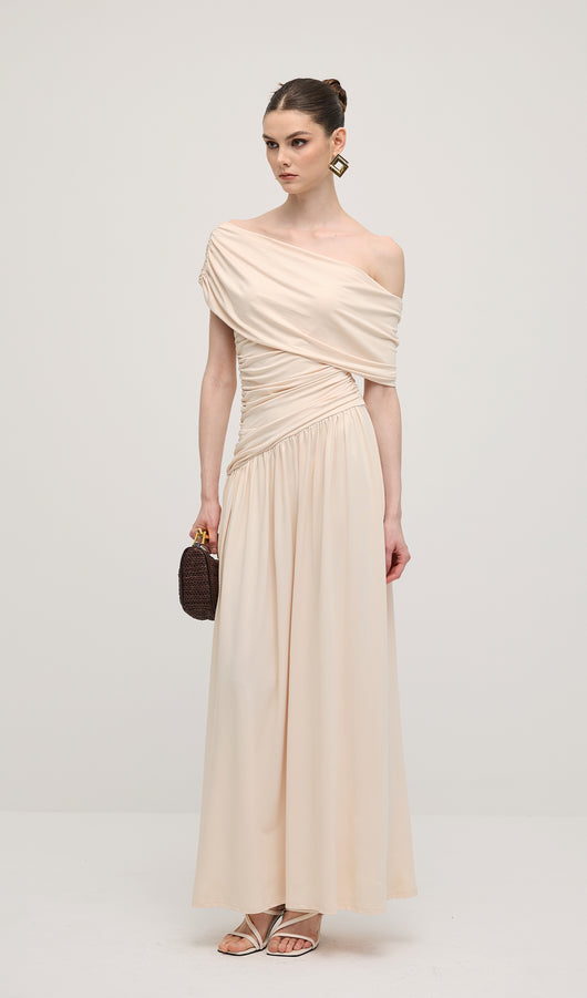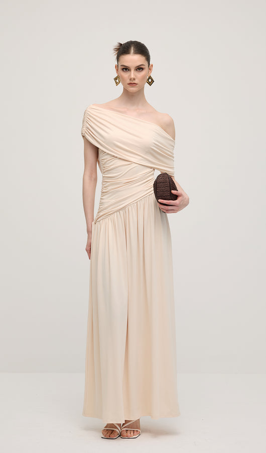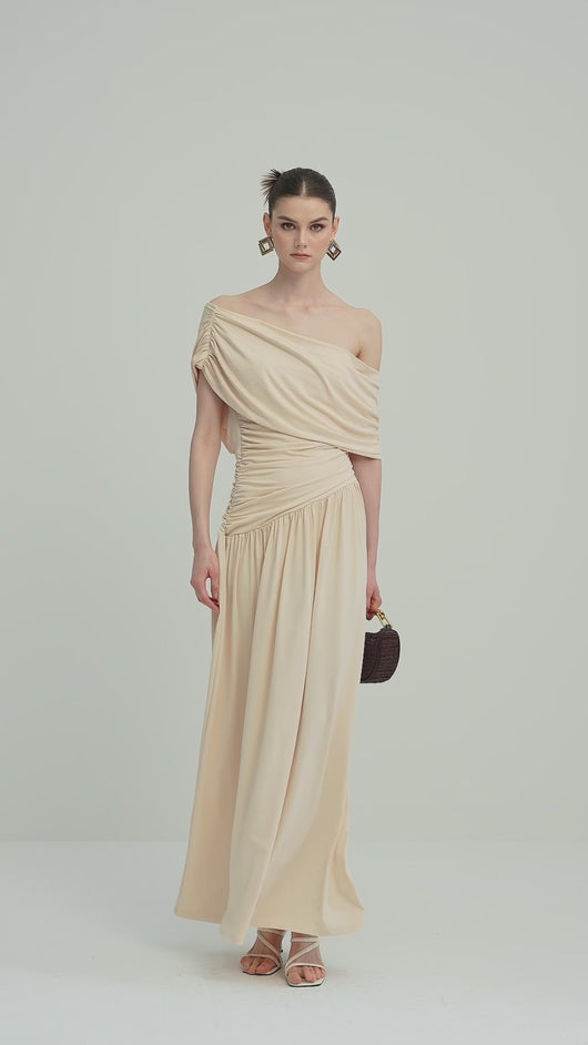 This elegant maxi dress features an off-shoulder design, crafted from a soft jersey fabric with side zipper closure. The pleated detailing adds texture and a flattering fit. Perfect for any occasion, this dress is a must-have addition to your wardrobe.