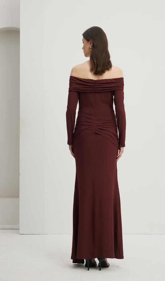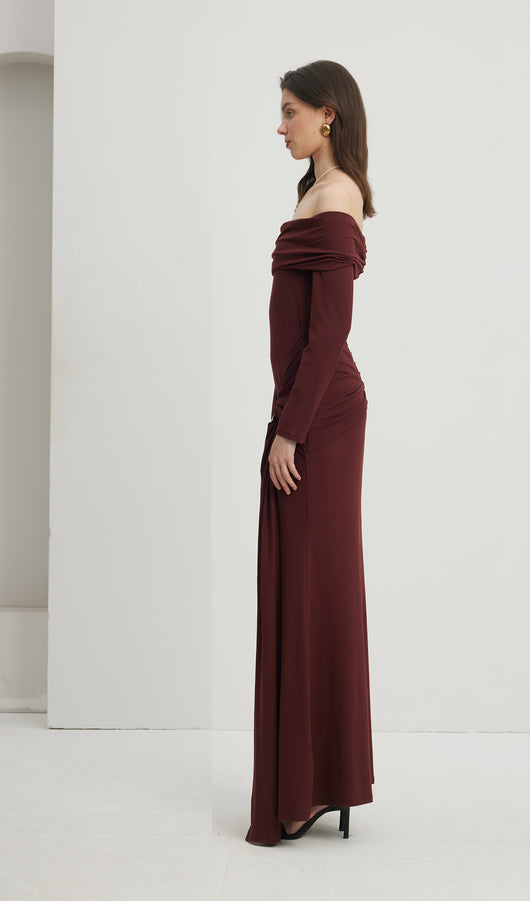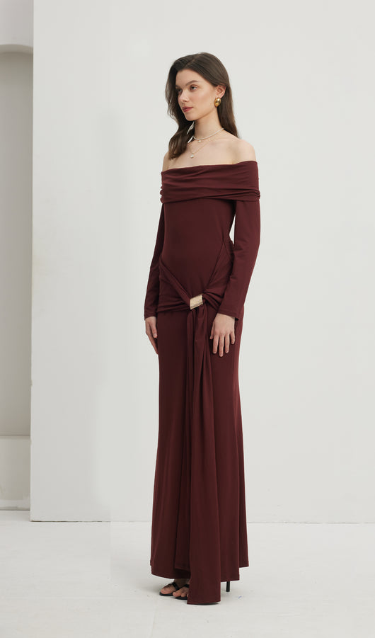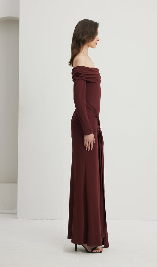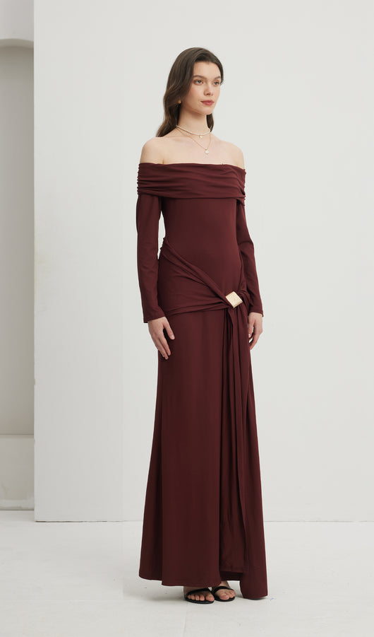 Off Shoulder Ruffle Maxi Dress Reddish Brown