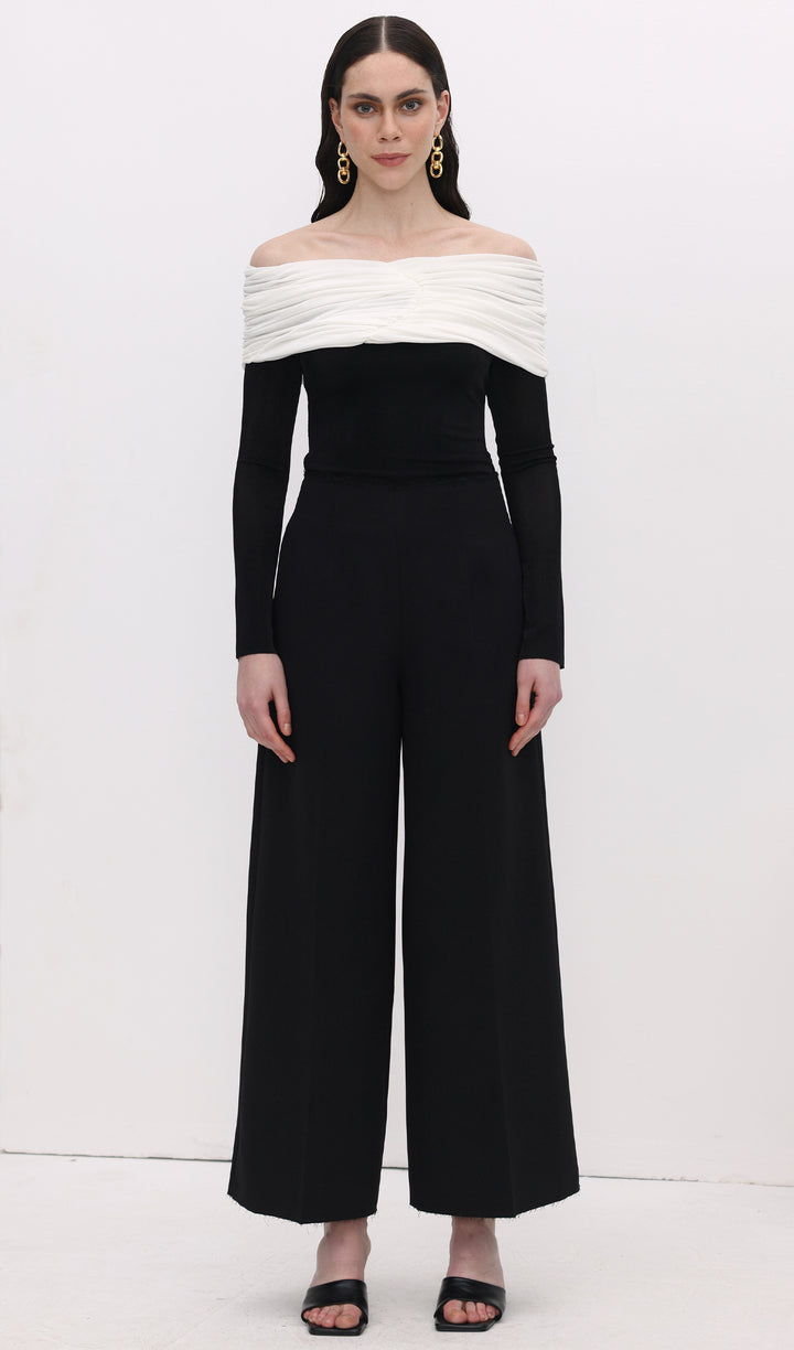 This elegant off-shoulder bodysuit features flared sleeves and draping, creating a flattering silhouette. With its flowy design, it can be dressed up or down for any occasion. Made from high-quality materials, it offers both comfort and style. Stay on-trend with this must-have addition to your wardrobe.