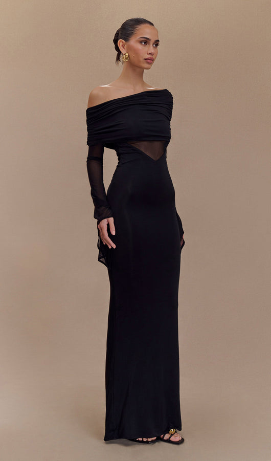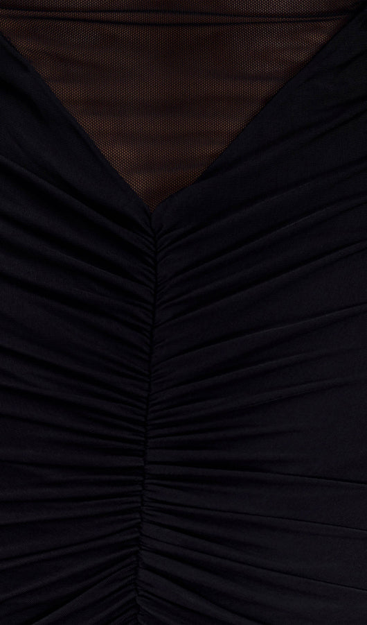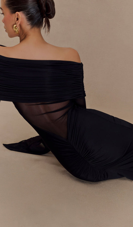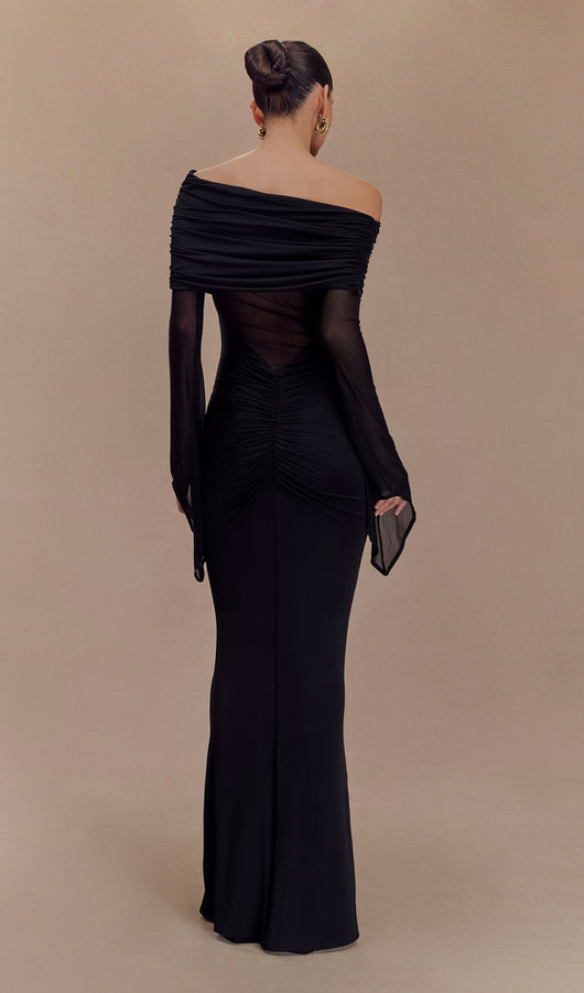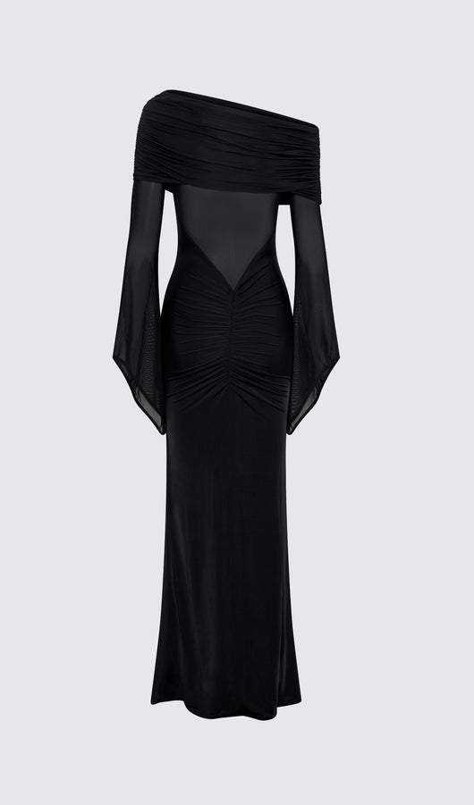 One Shoulder Slinky Ruched Maxi Dress-Black