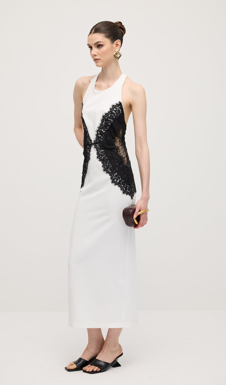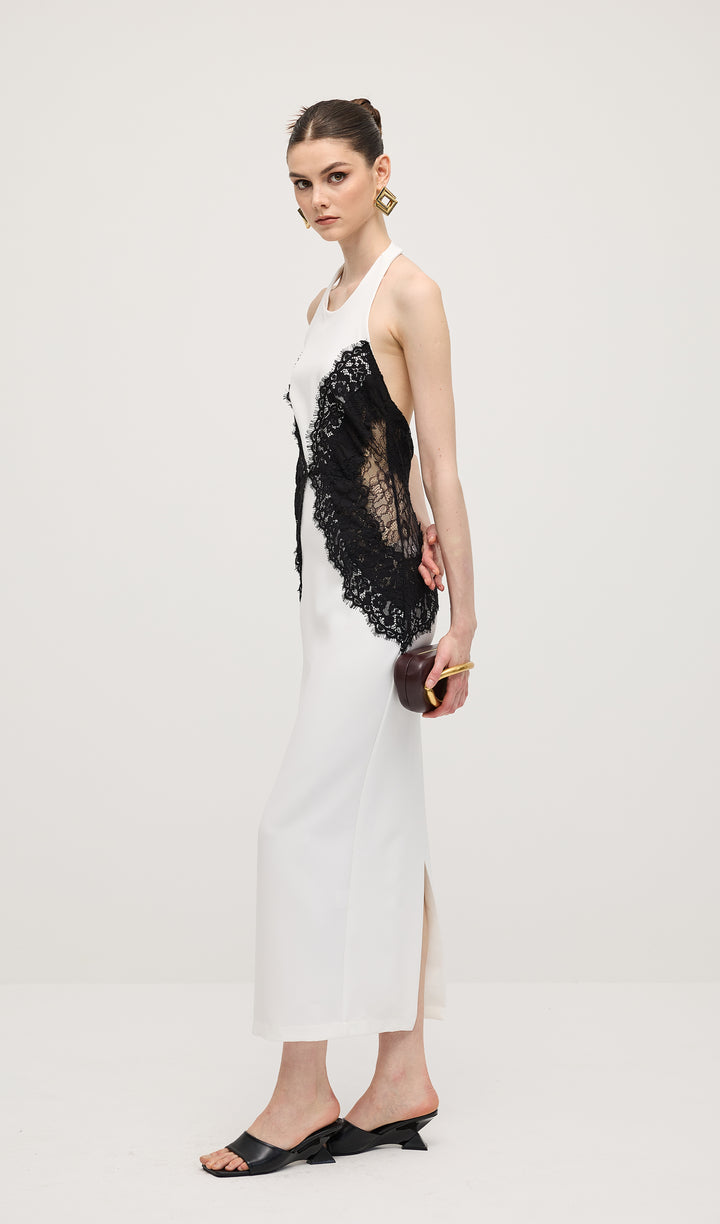 Enhance your elegant style with our Open Back Maxi Dress. The intricate lace detailing adds a touch of femininity, while the open back design exudes confidence and sophistication. Made from a flowy crepe material, this dress is perfect for any special occasion. Elevate your wardrobe today.