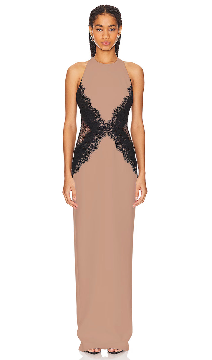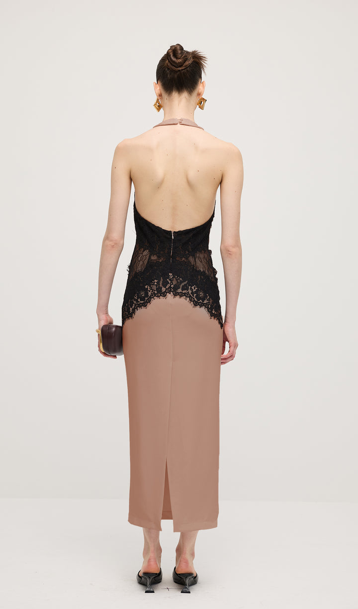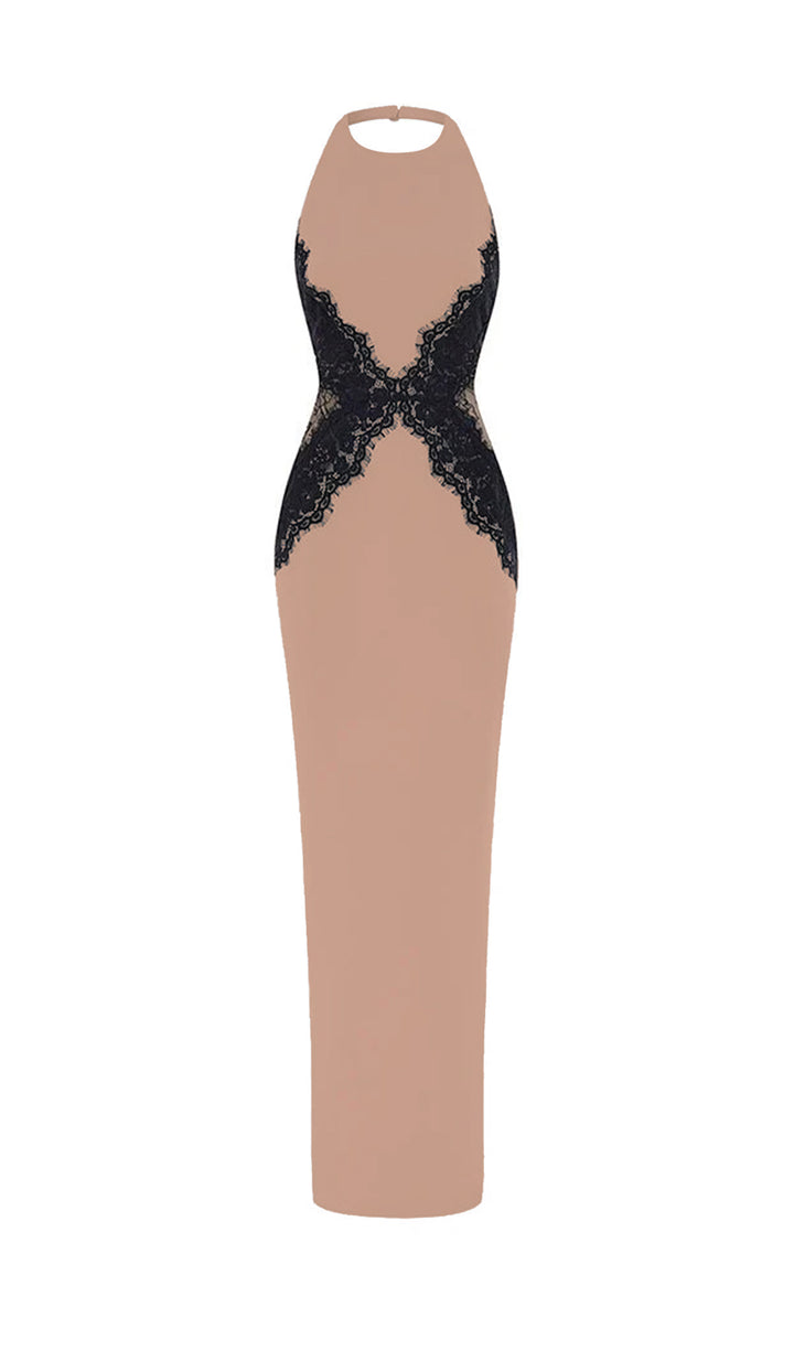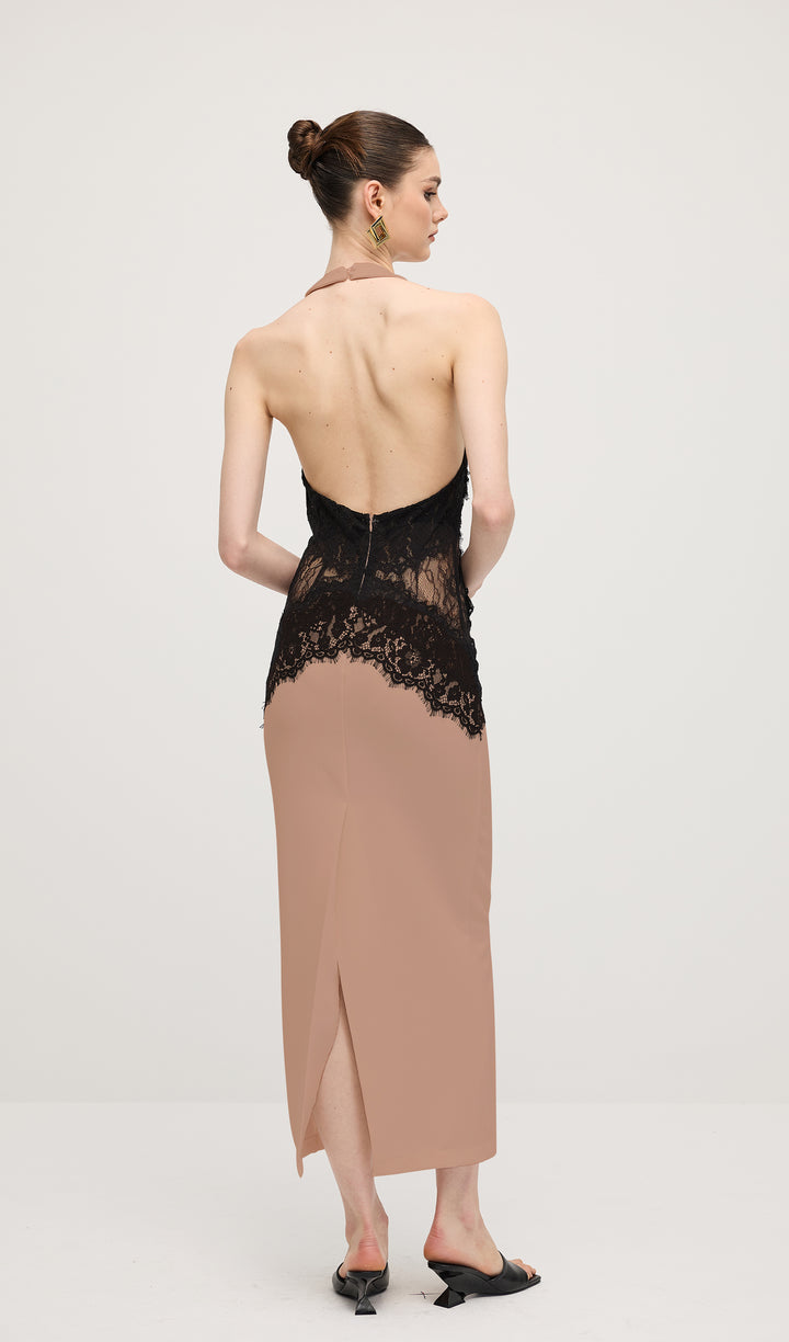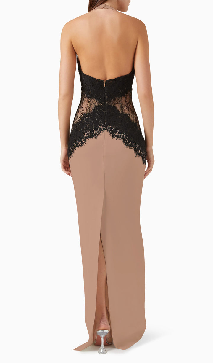Enhance your elegant style with our Open Back Maxi Dress. The intricate lace detailing adds a touch of femininity, while the open back design exudes confidence and sophistication. Made from a flowy crepe material, this dress is perfect for any special occasion. Elevate your wardrobe today.