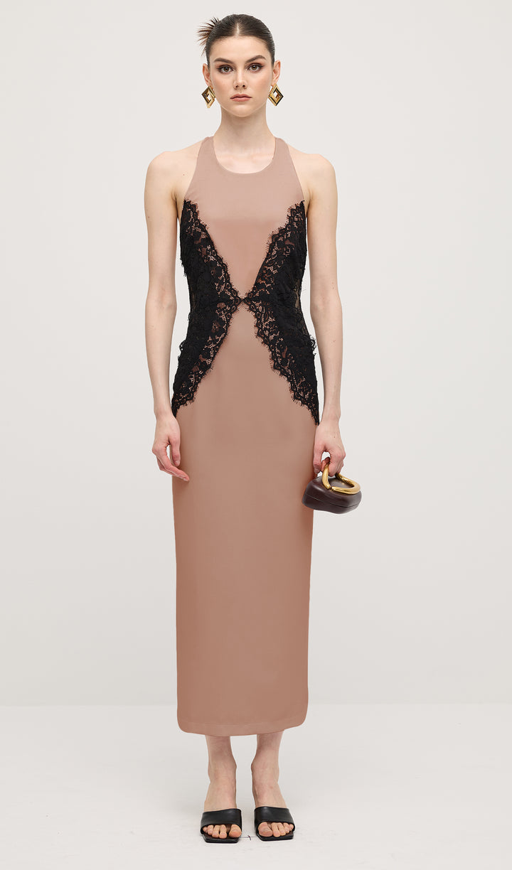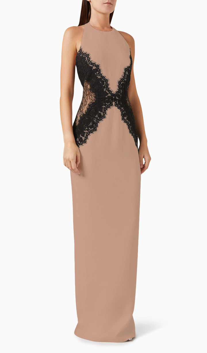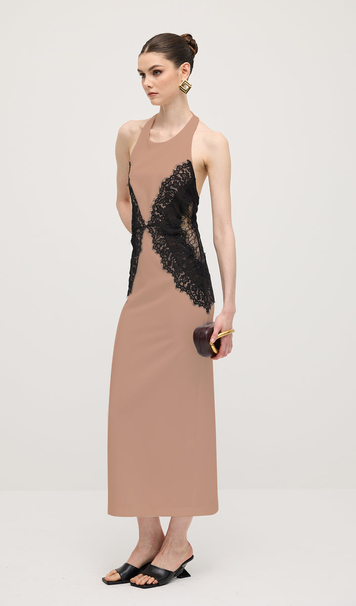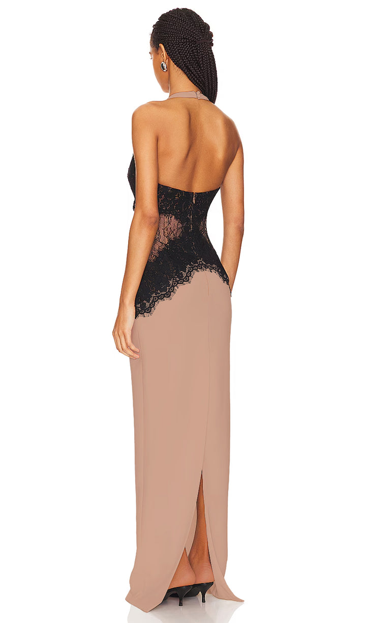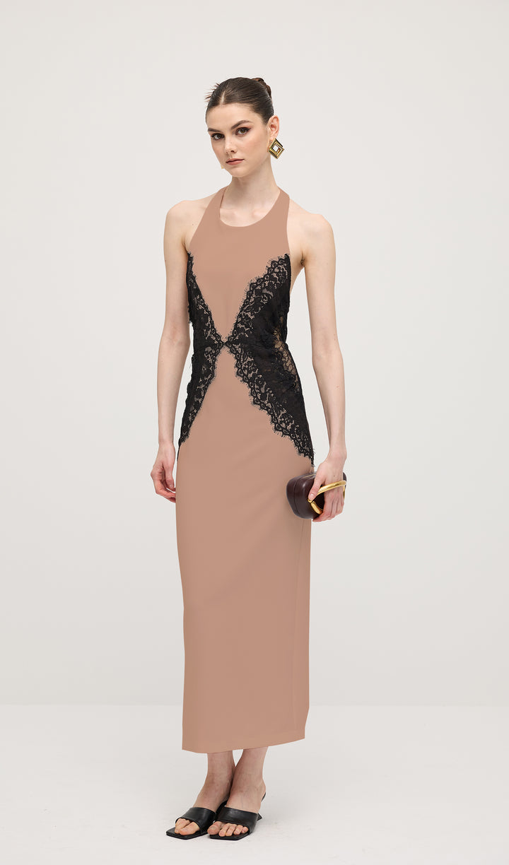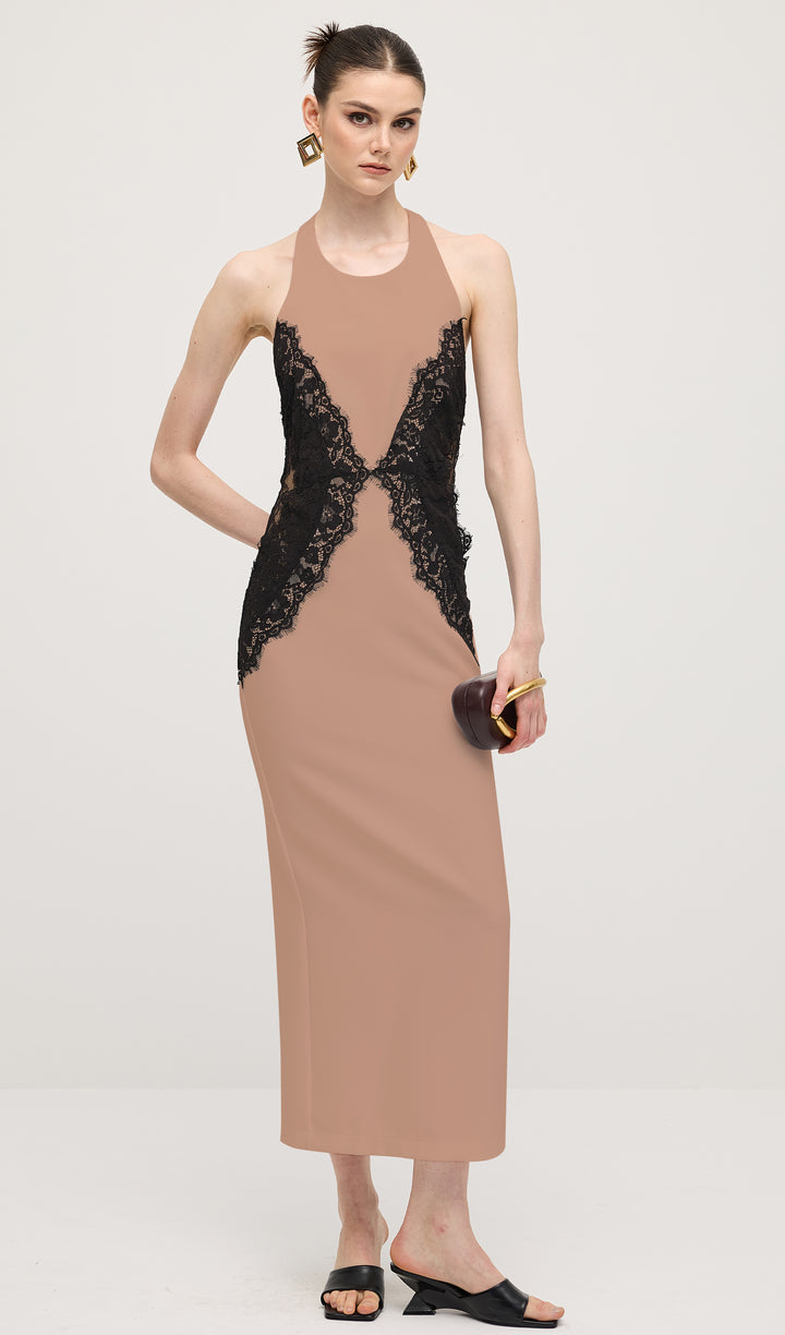 Enhance your elegant style with our Open Back Maxi Dress. The intricate lace detailing adds a touch of femininity, while the open back design exudes confidence and sophistication. Made from a flowy crepe material, this dress is perfect for any special occasion. Elevate your wardrobe today.