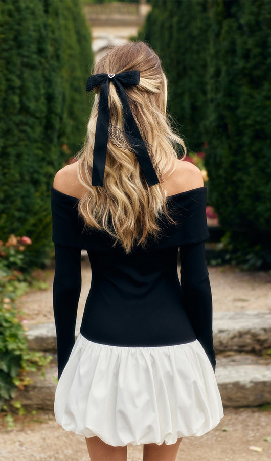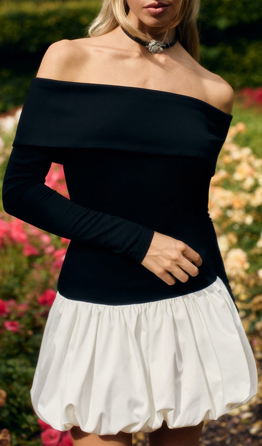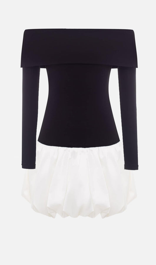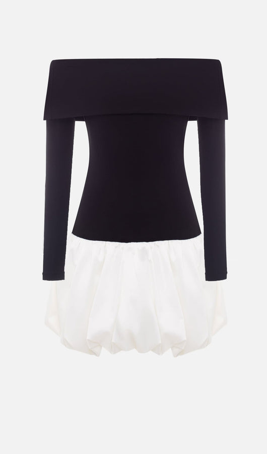 Playful mini dress made from a combination of two materials. The dress has an elasticated bodice with open shoulders and fitted long sleeves, and a voluminous balloon skirt.