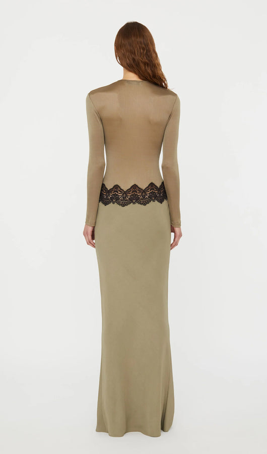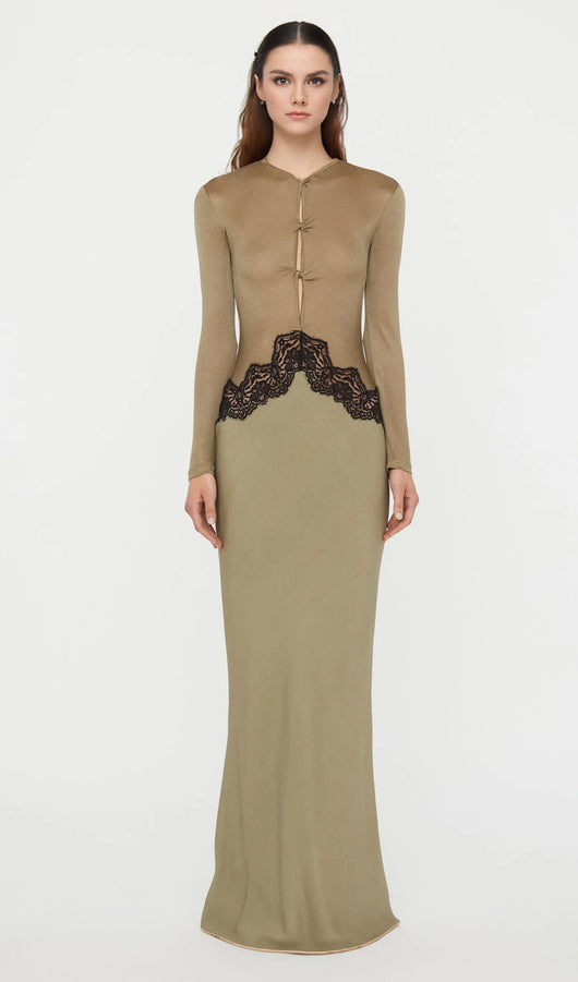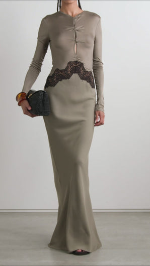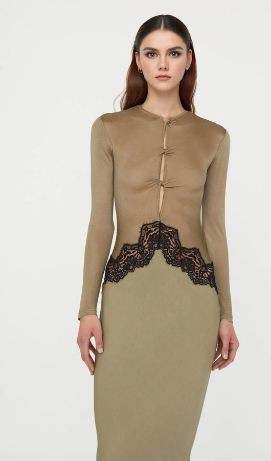 Pragmatic & feminine details combine to form this lace insert long sleeve maxi dress. Fine rib stretches with ease to the body, whilst sheer lace traces the torso. Twist cut out details draw the eye in.
