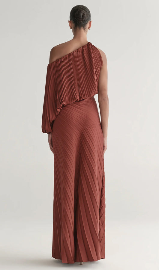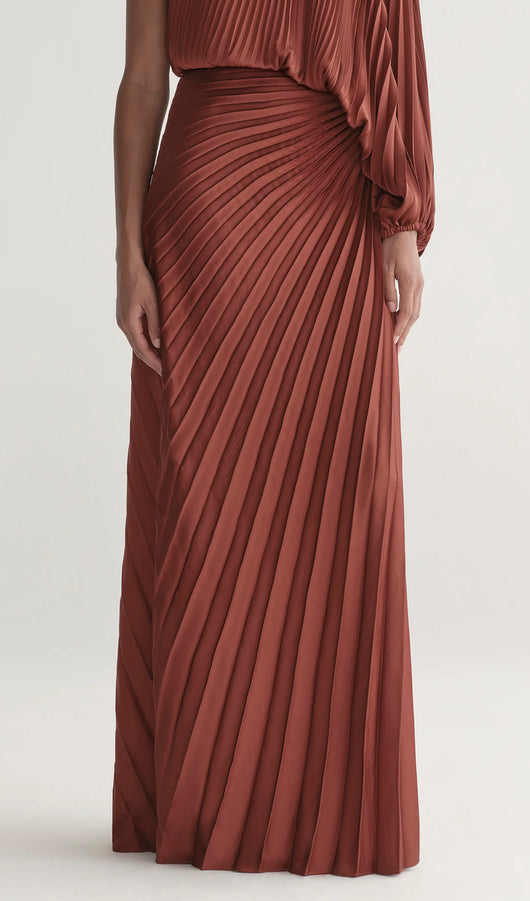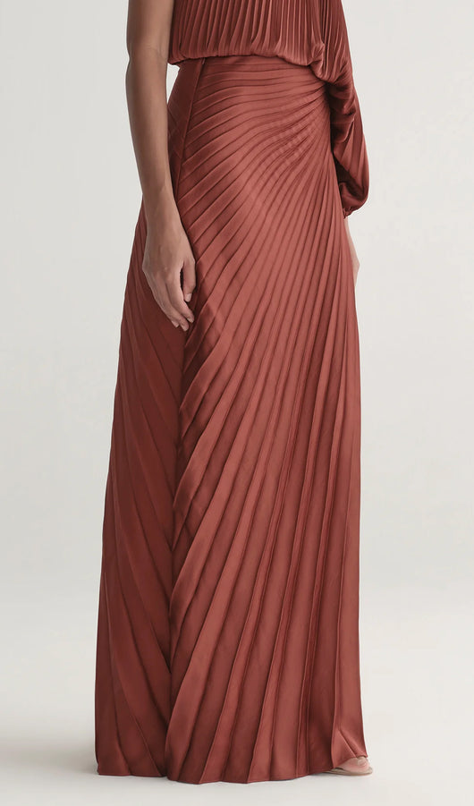 The Skirt showcases our signature starburst pleating in fluid vintage satin. Designed in a rich rust hue, this maxi silhouette features soft ruching at the hip and an asymmetric hem that creates graceful movement and elongation. A refined piece that brings modern texture and dimension to occasion dressing.
