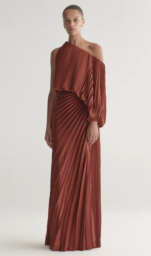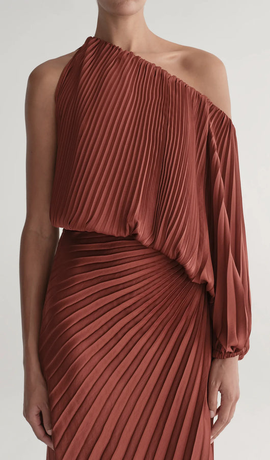- One-shoulder pleated silhouette with billowed sleeve