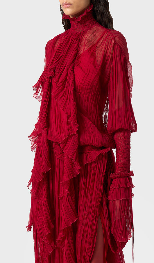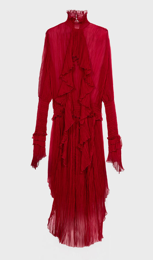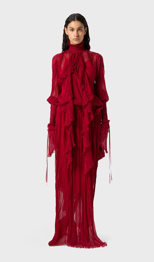 Elevate your wardrobe with this red Pleated Silk-Chiffon Slit Maxi Dress, expertly designed to combine elegance and movement. Featuring delicate ruffles along the front and side slits, it offers both a romantic silhouette and effortless breathability. The back cutout adds a contemporary edge, while the soft draping enhances comfort and flow. Ideal for formal occasions, this dress showcases refined craftsmanship with luxurious silk-chiffon fabric for a sophisticated, graceful look.