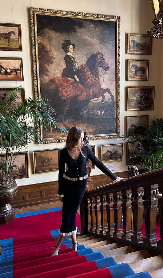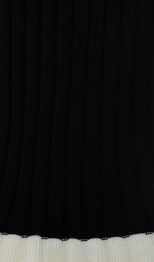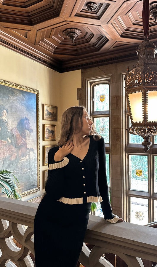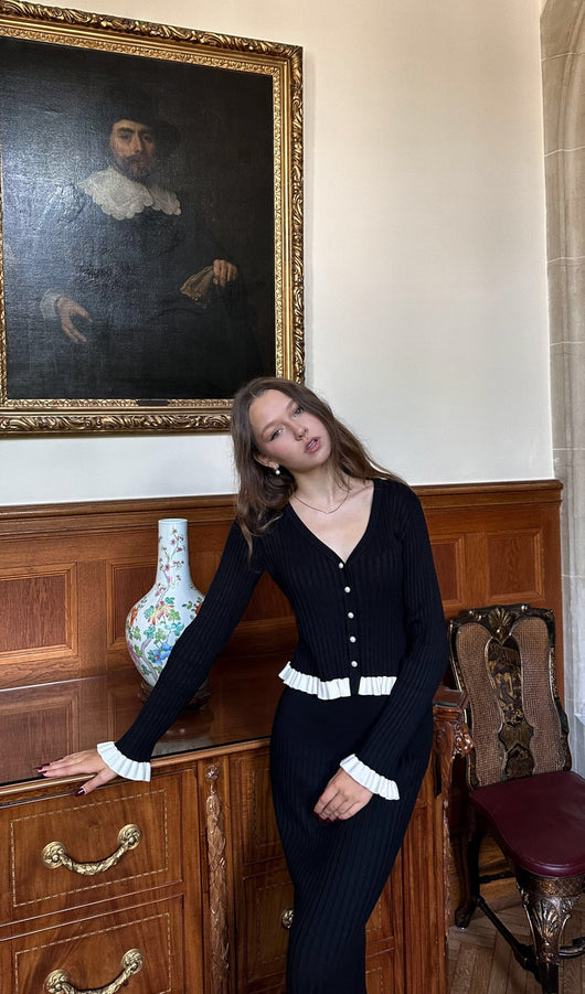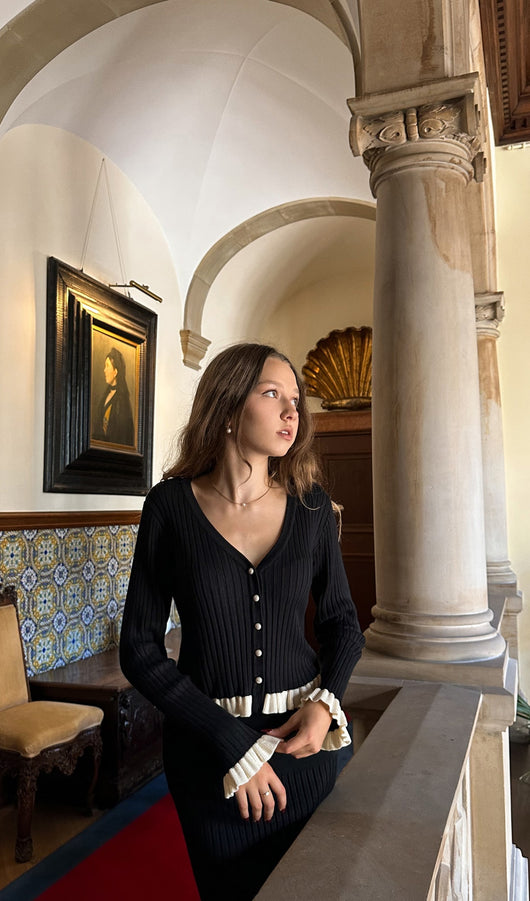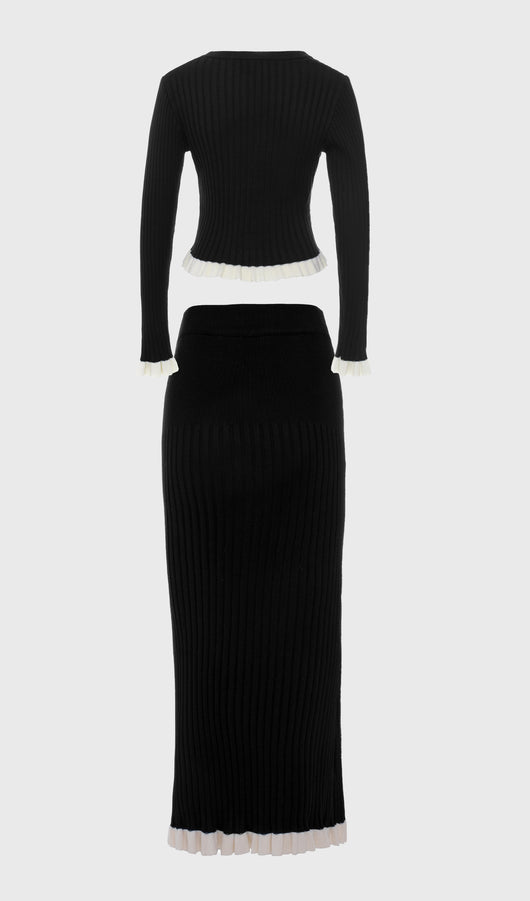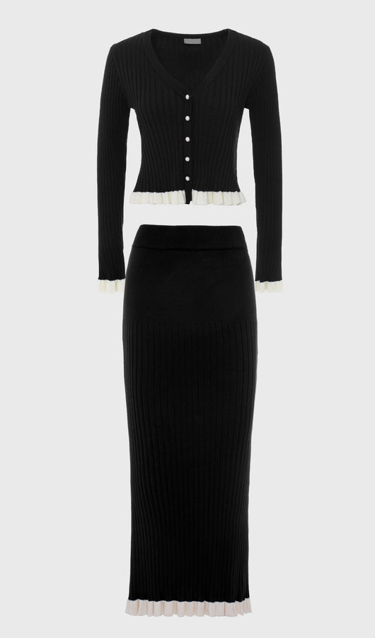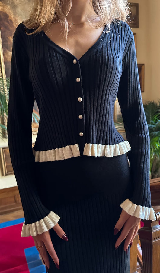 A cropped fitted cardigan with a deep V-neck and a fastening with small mother-of-pearl buttons. The model is made of thick ribbed knitwear and complemented with contrasting frills on the cuffs and hem. The midi skirt with a fitted silhouette and a high waist, made of large ribbed knitwear and complemented with a contrasting frill along the hem.