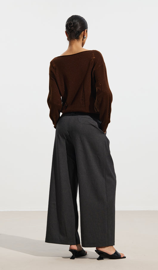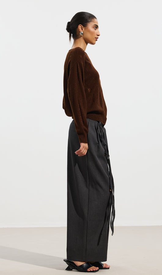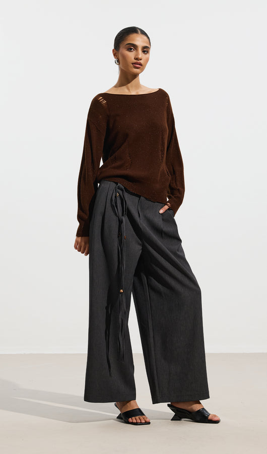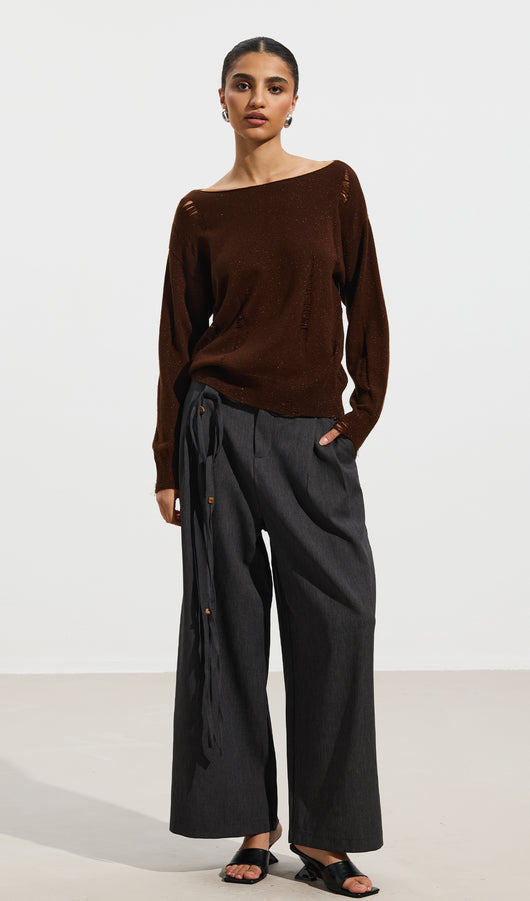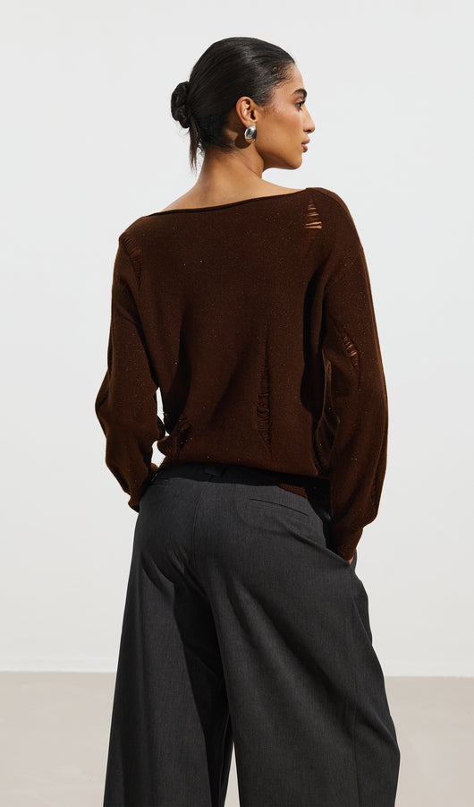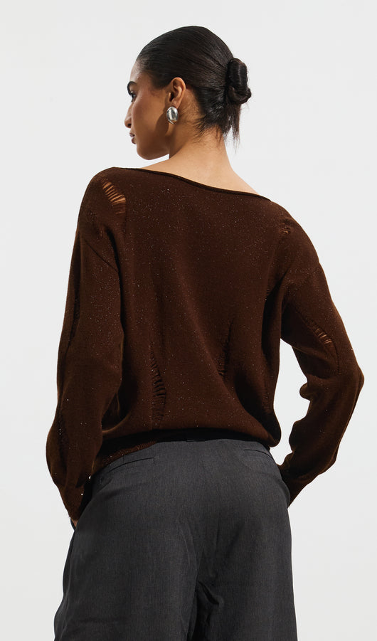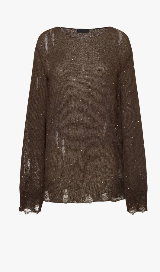 This sweater blends downtown edge with uptown glamour in one effortlessly cool piece. The loose, slouchy fit drapes with an air of nonchalant sophistication, while the boat neckline adds a touch of French-girl insouciance. The artfully placed rips and raw, unfinished hems that give it an underground vibe perfectly contrasted by the shimmering cascade of hand-scattered sequins that catch the light with every movement.