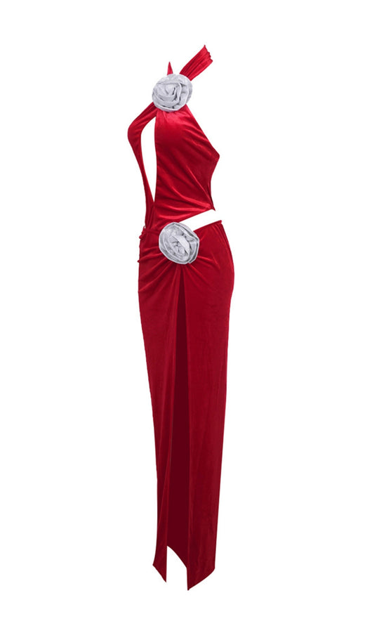 Introducing the Maxi Dress, a stunning piece in luxurious red. Its cutout front and oversized floral embellishments add an artistic touch to the waist and neckline. Elevate your style with this elegant and exclusive dress.