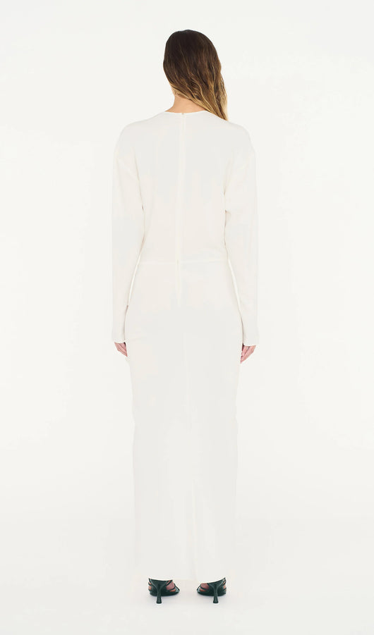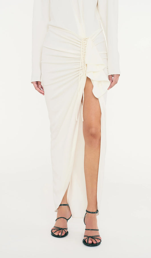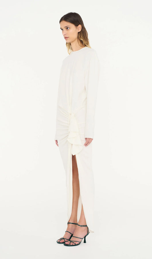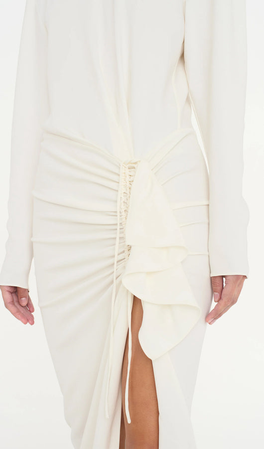 Delicate ruched ties secure the body of an oversized maxi dress silhouette. Finished with cascading panels that fall away from a split skirt.