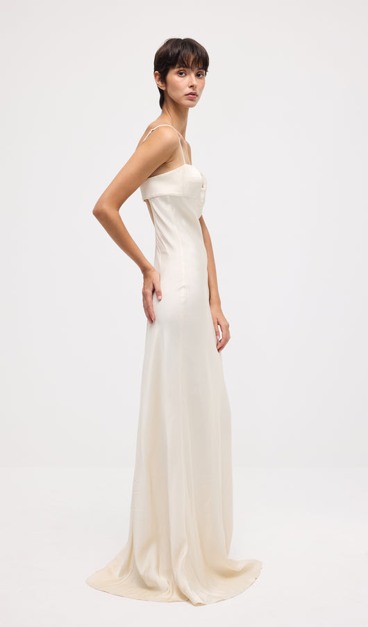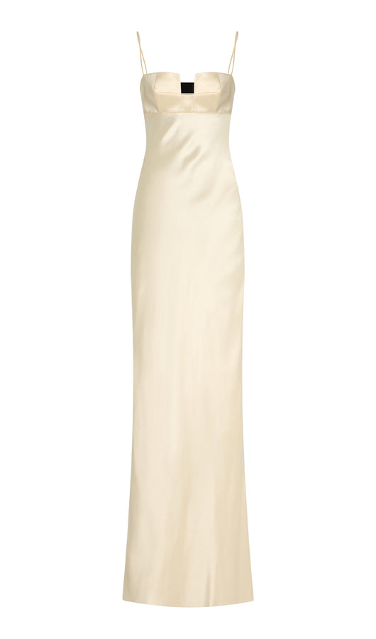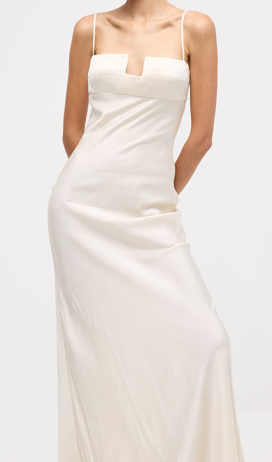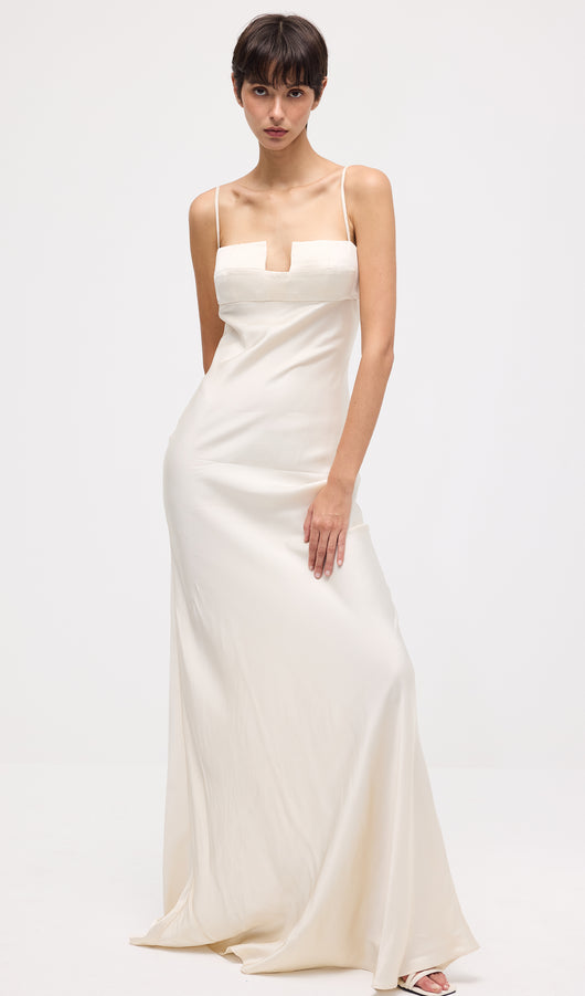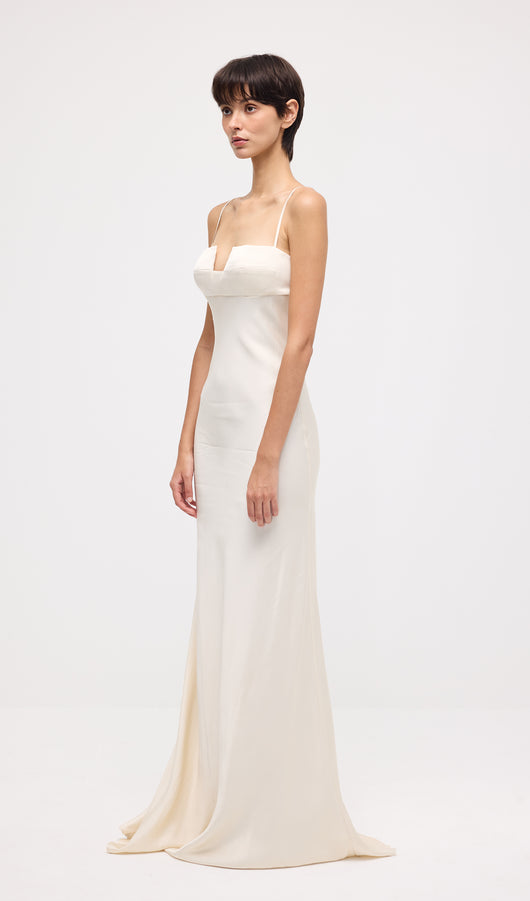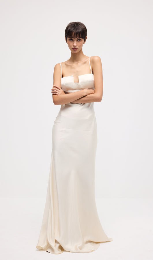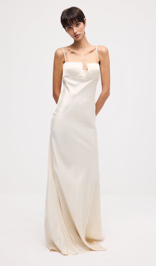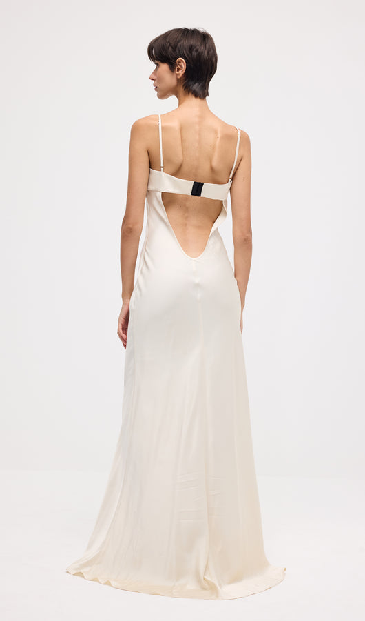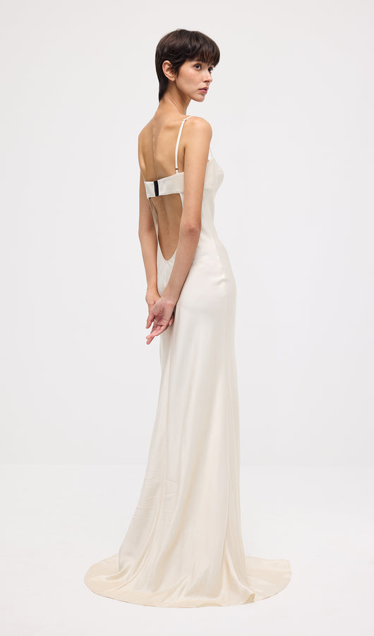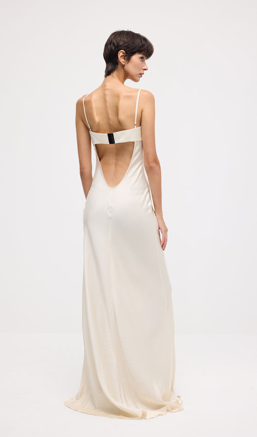 Close-fitted long dress with open back, thin detachable adjustable straps and pointed detail at bust. Back bra closure.