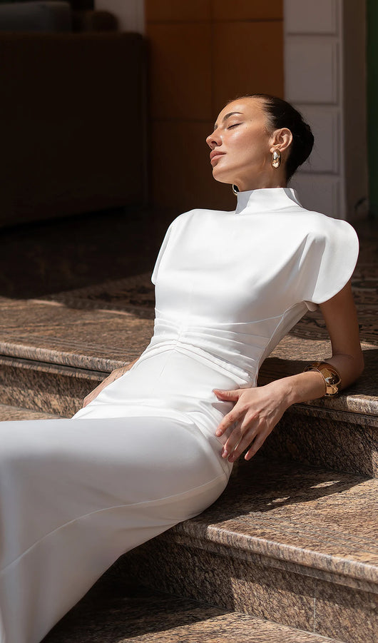 Elevate your evening wardrobe with this sophisticated satin maxi dress, featuring a refined high neckline and dramatic puff sleeves that command attention. Crafted from luxurious satin fabric, this floor-length silhouette drapes elegantly while maintaining structure through the bodice. The voluminous sleeve design adds contemporary flair to a timeless silhouette, making it an ideal choice for formal events, galas, or upscale celebrations. The high neck provides modest coverage with undeniable elegance, while the flowing maxi length creates a graceful, elongated line. Perfect for those seeking a statement piece that balances classic sophistication with modern design sensibility.