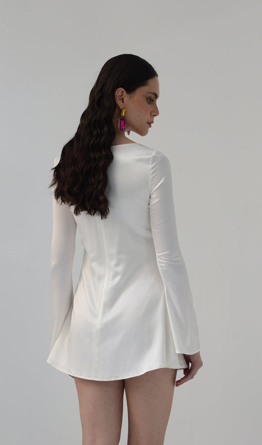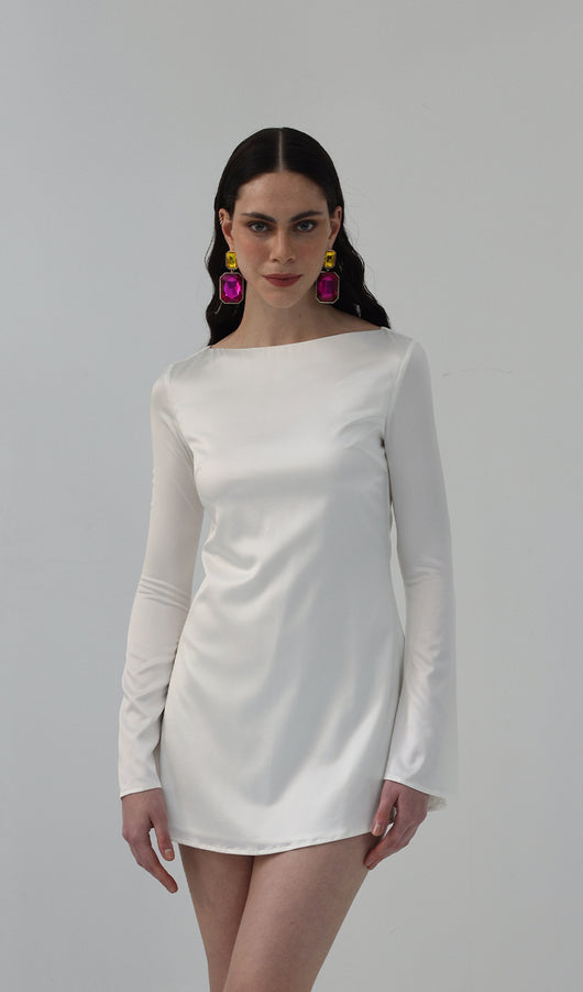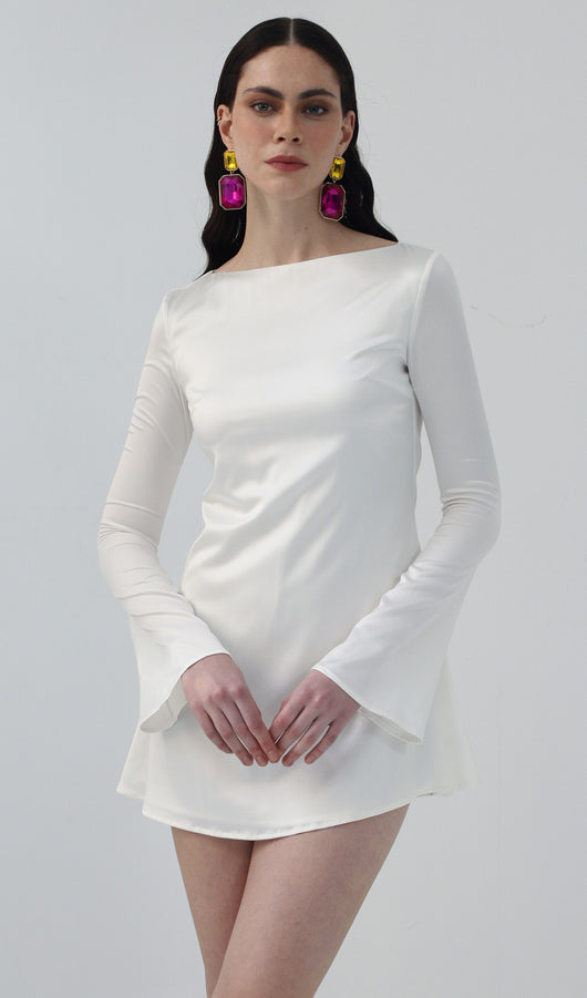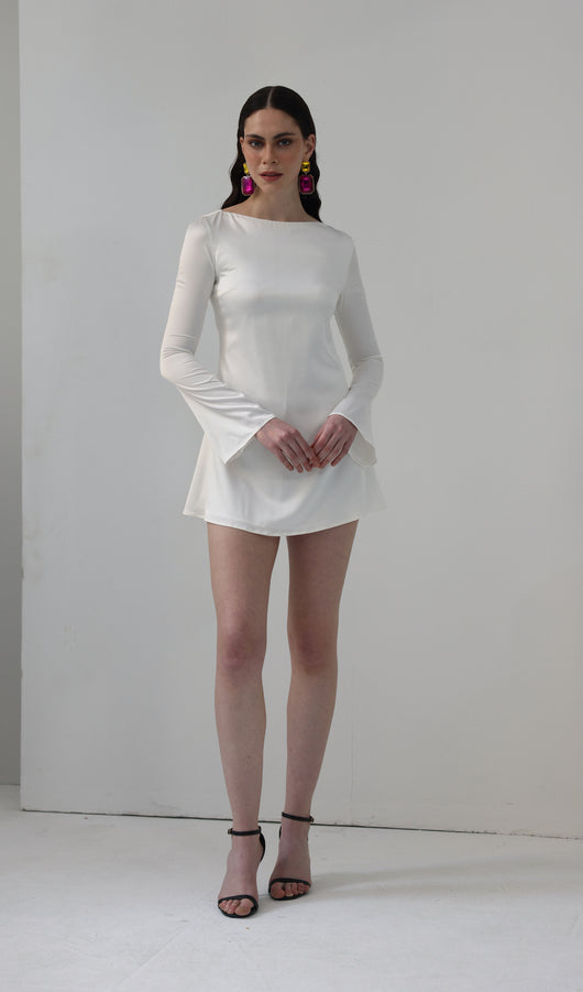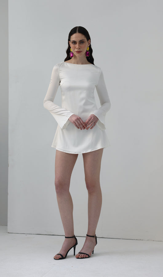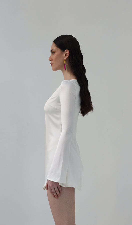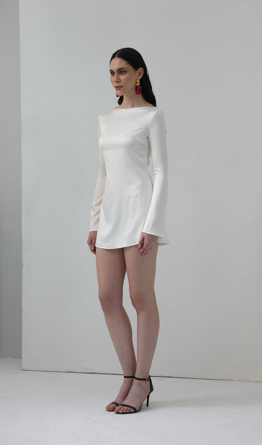 Embody grace in the dress, the perfect summer dress in ivory white. This bias-cut design features a flattering boat neckline and long bell sleeves, striking a perfect balance between elegance and playfulness. With its versatile closed back, it's truly the perfect dress for any occasion. Made from Oeko-Tex certified 50% ecovero 50% viscose satin fabric, it offers a beautiful drape and softness. A go-to for radiant brides at showers or engagement soirées.