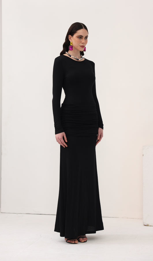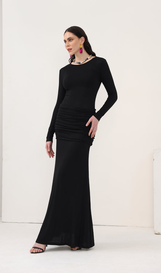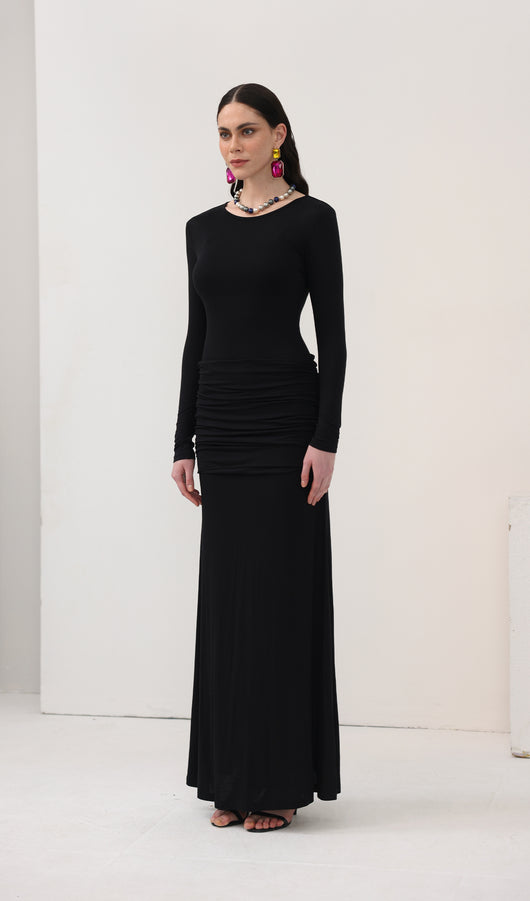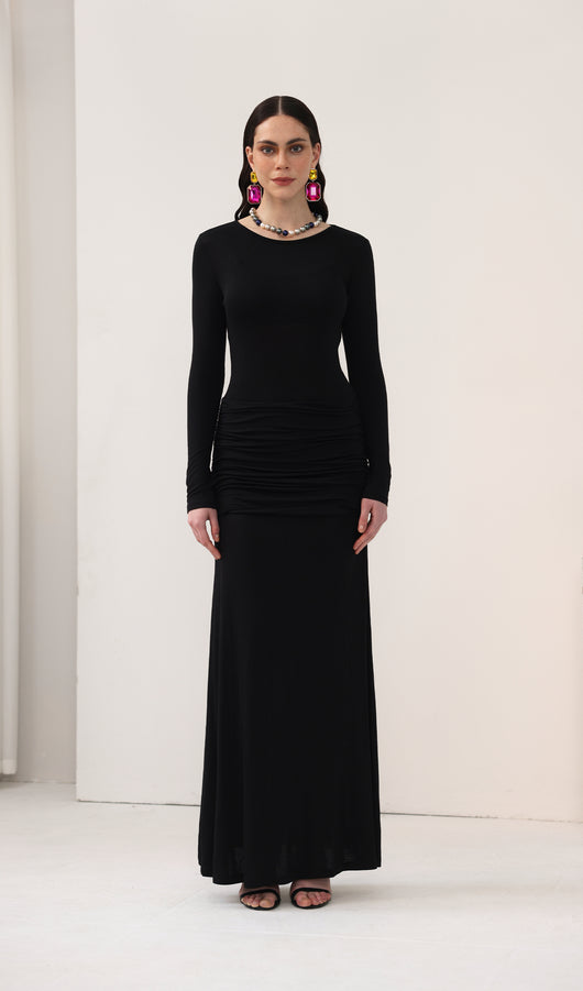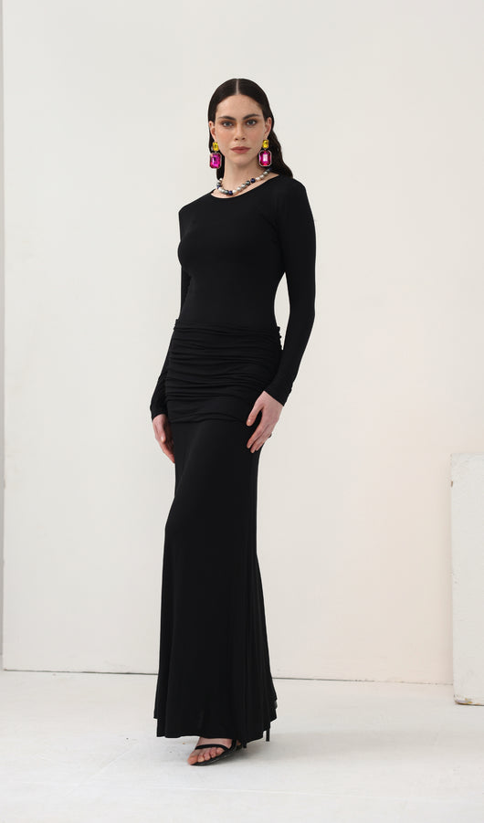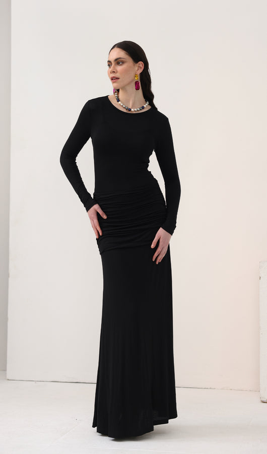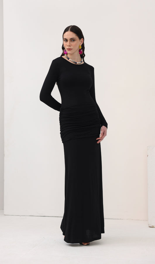 Spectacular maxi dress with a fitted bodice, complemented by an oval neckline and long sleeves, along with a lightweight floor-length skirt. The model is made from thin semi-transparent jersey and has dense inserts on the chest and hips, forming an original layering.