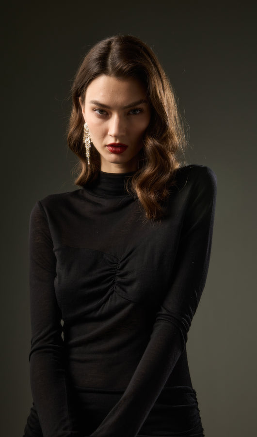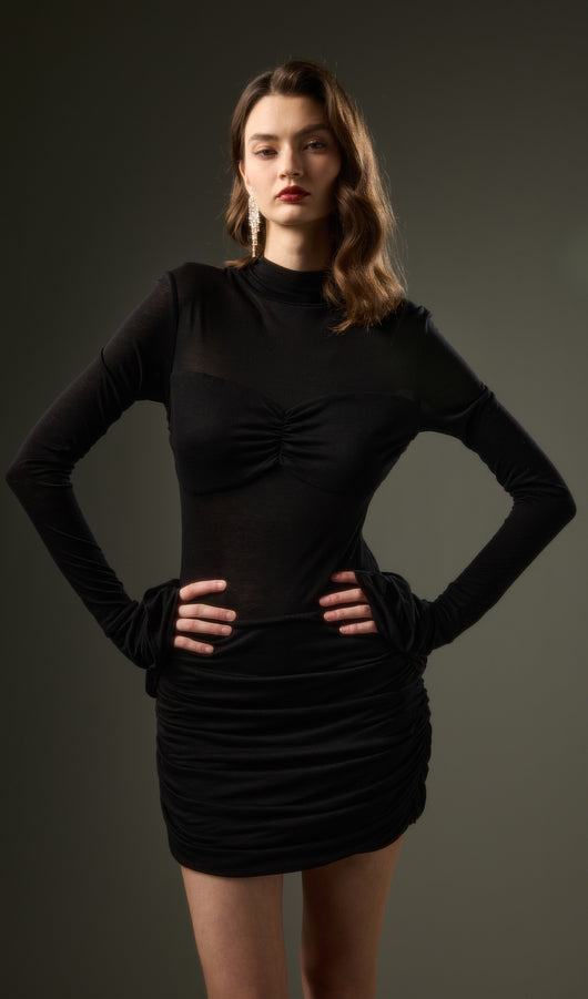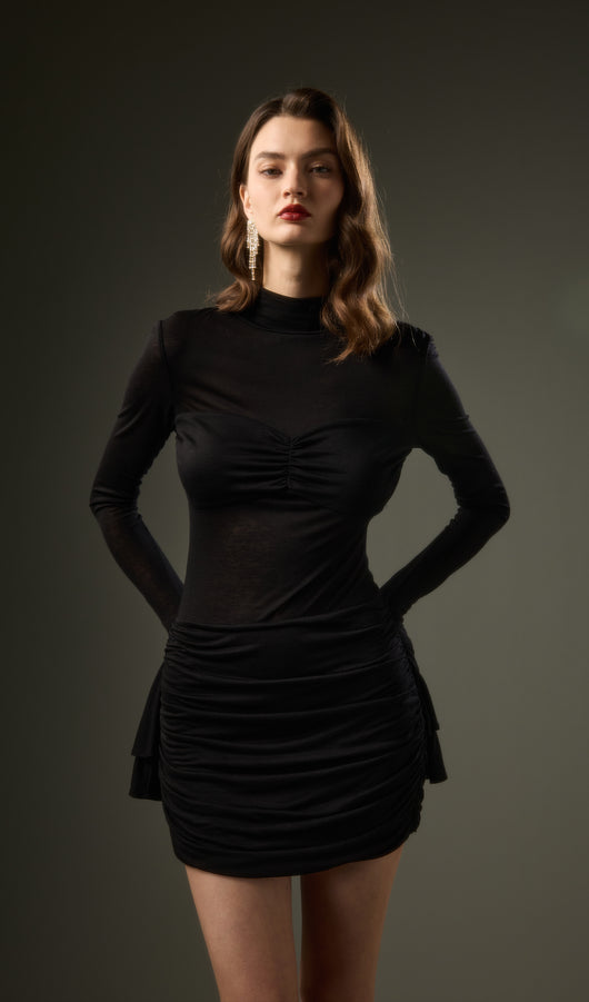 Mini fitted dress with a high collar, fitted long sleeves with voluminous flounces on the cuffs and a straight skirt. The dress is made from stretchy semi-transparent fabric and is complemented with multi-layered draperies on the bodice and skirt.