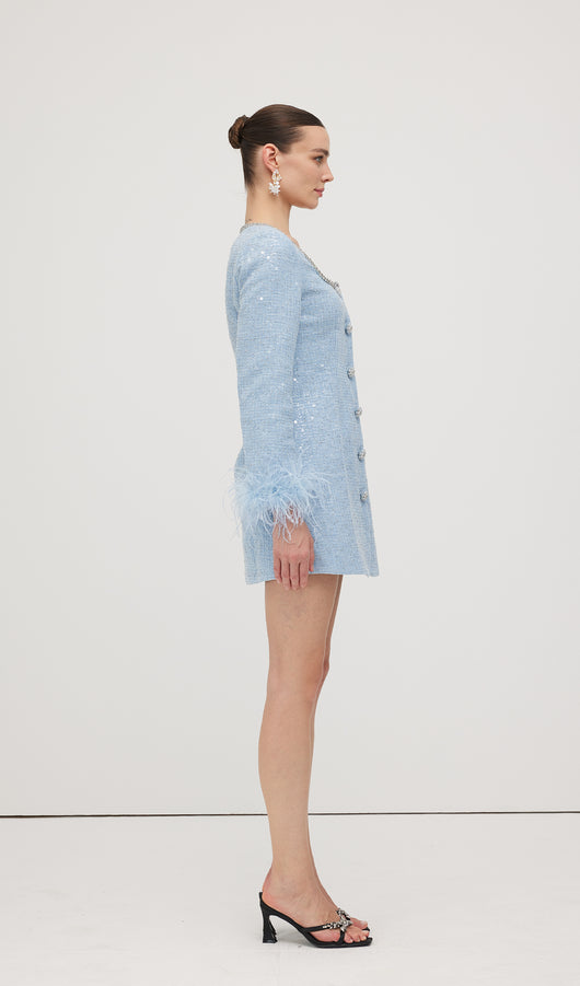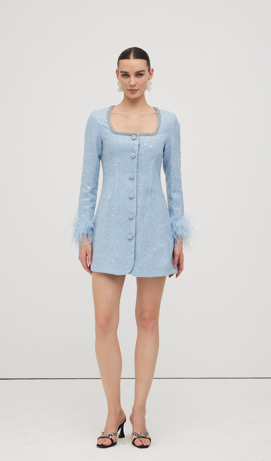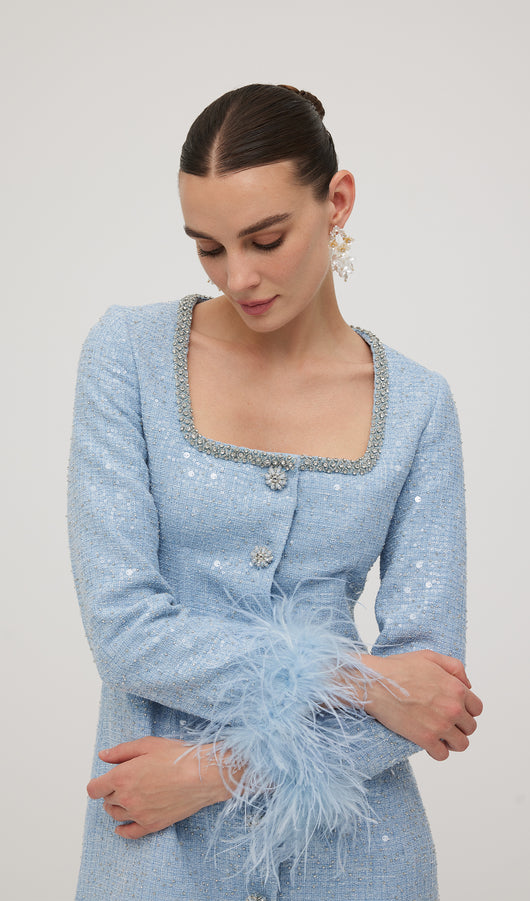 Sleek lines meets maximalist accents in this party dress, cut from sequinned bouclé for its structure and sparkle. Diamanté buttons and feather cuffs amp up the drama on its timeless silhouette.