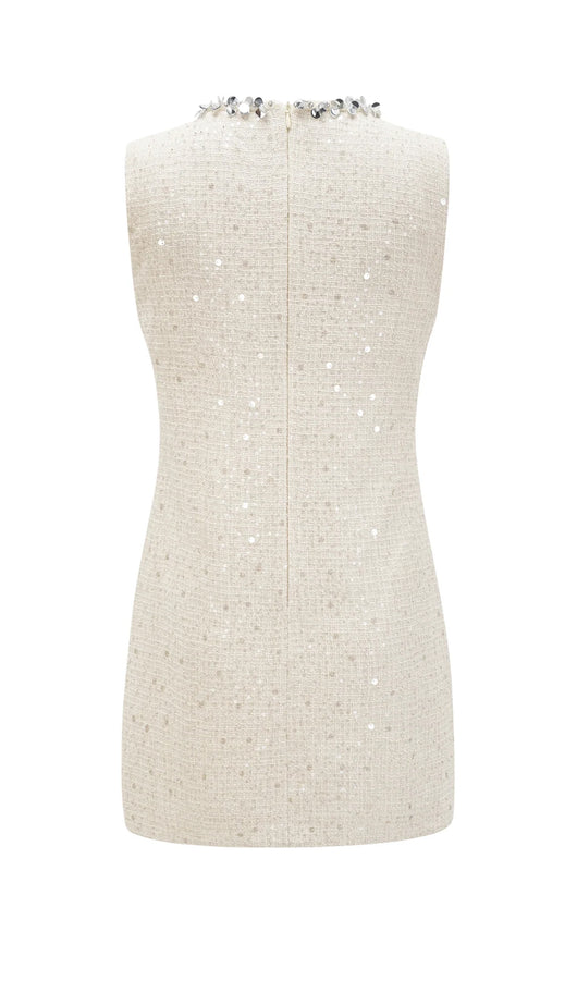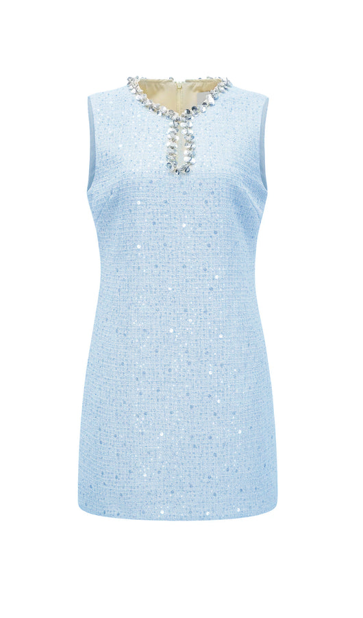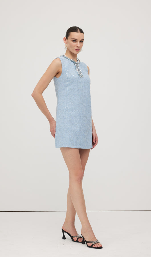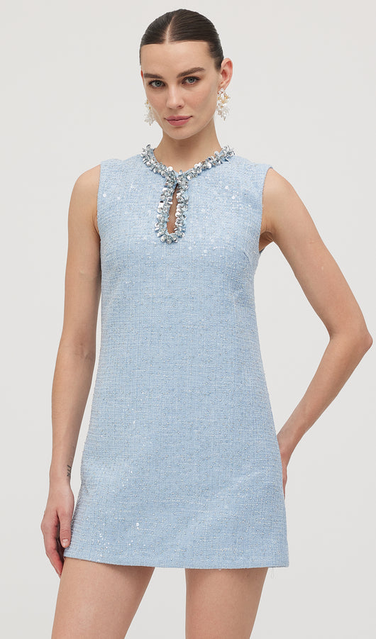 The perfect party dress whether you're fashionably late or effortlessly punctual, this flirty mod-inspired number — cut from blue sequinned bouclé for an impeccably tailored fit — will make a statement regardless. Its crew neckline and keyhole cut-out are embellished with eye-catching trim, and fall to a shift silhouette for a leg-lengthening effect. Style it with sky-high platforms and a matching Bow Bag for your next late night rendezvous.