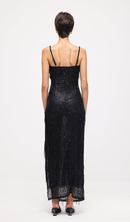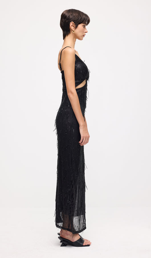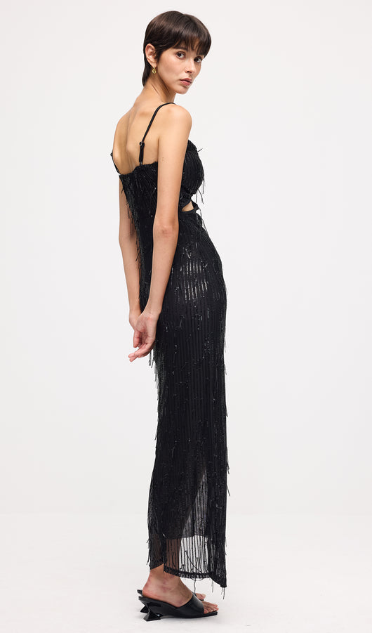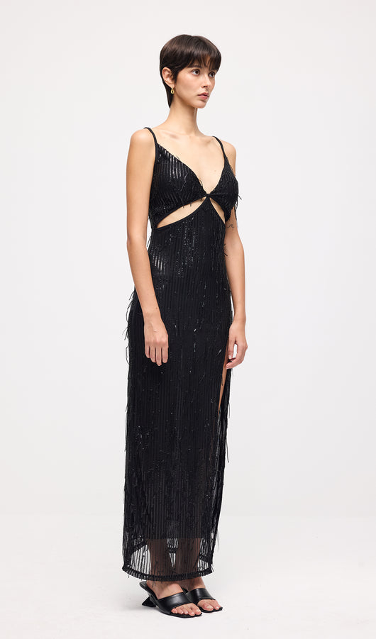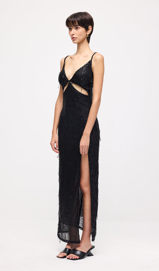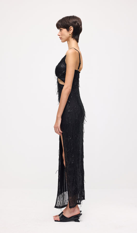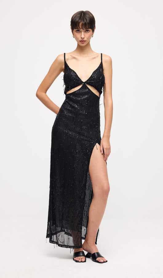 Elevate your eveningwear with the Sequin Cut Out Slit Maxi Dress, expertly designed to combine glamour and sophistication. The shimmering sequins catch the light beautifully, while the strategic cut-outs add a modern, edgy appeal. A thigh-high slit enhances movement and allure, making this dress an impeccable choice for formal events and special occasions where standout elegance is paramount.