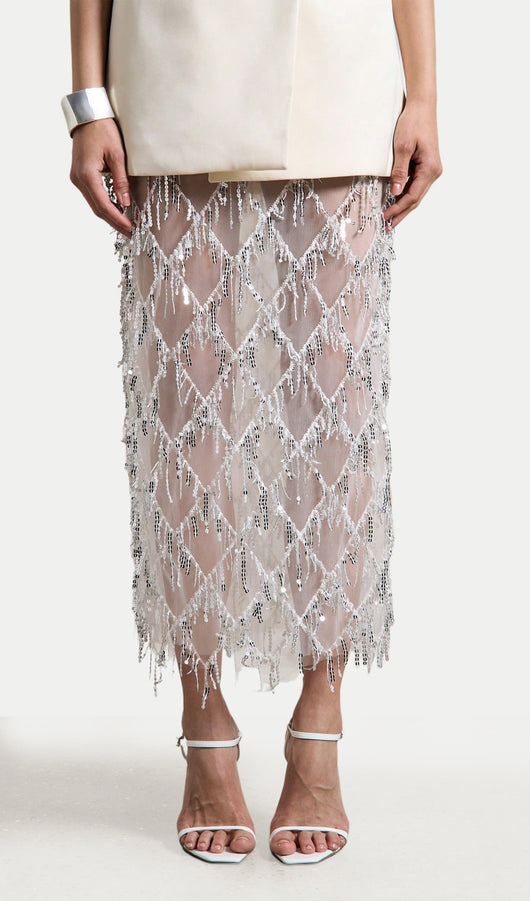 Sheer Sequined Midi Skirt In White