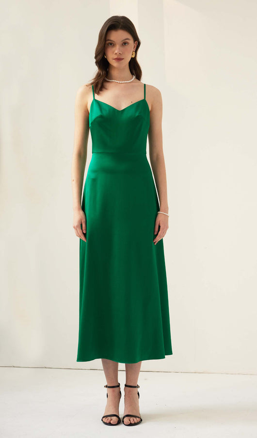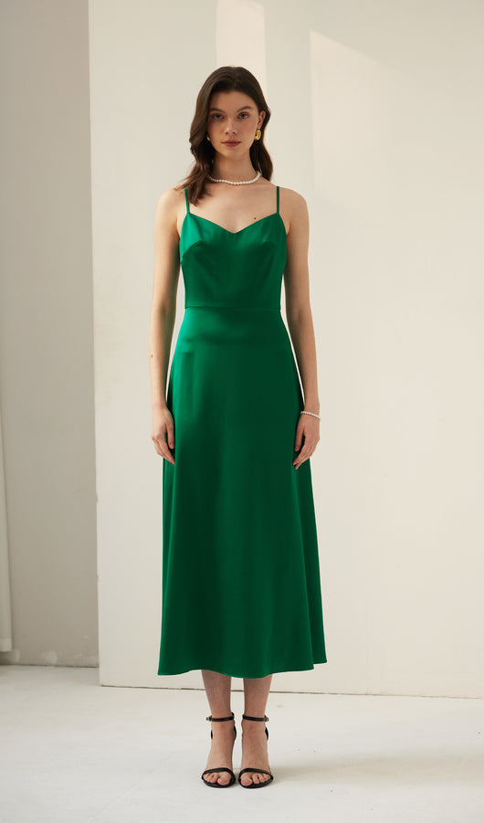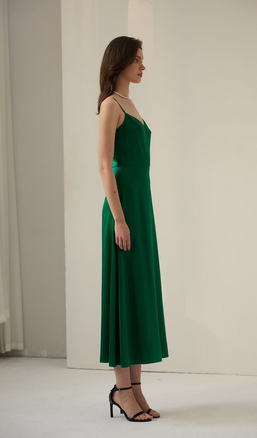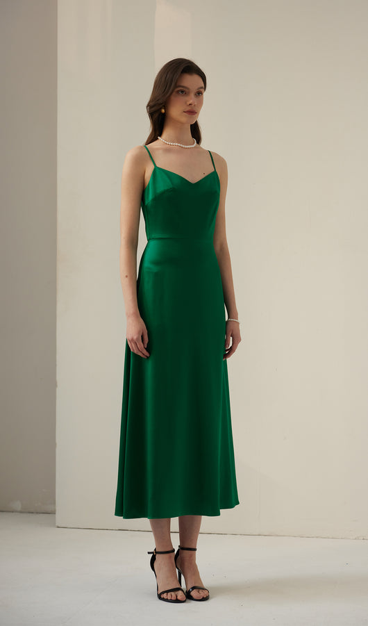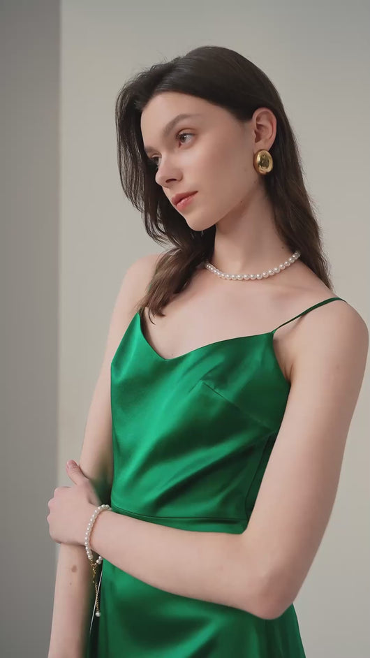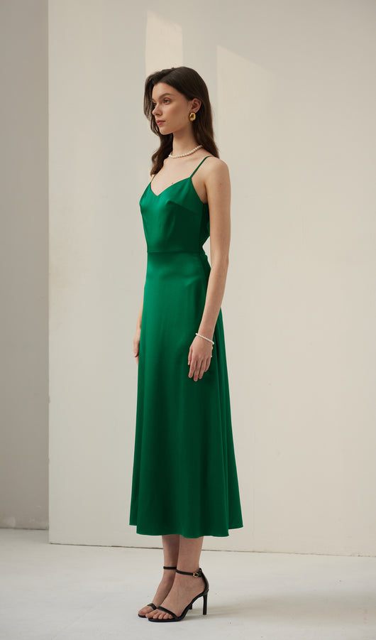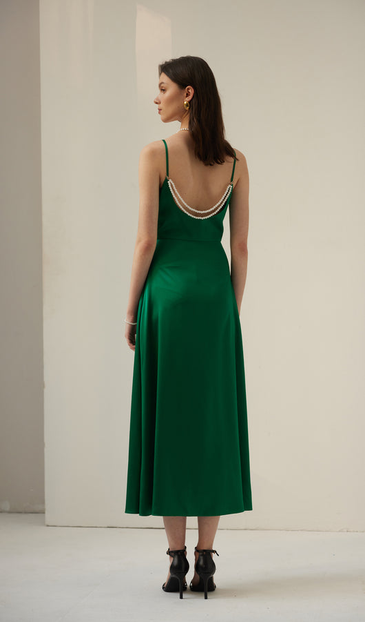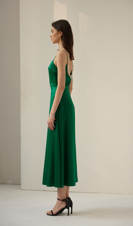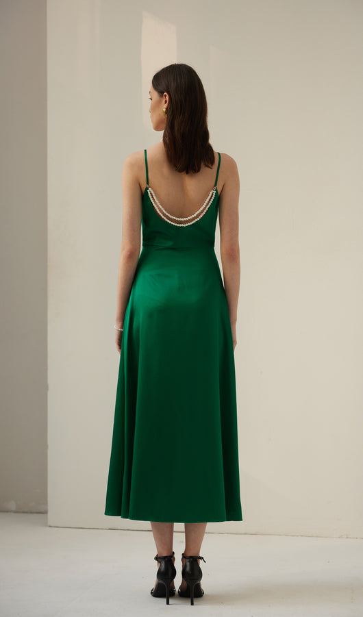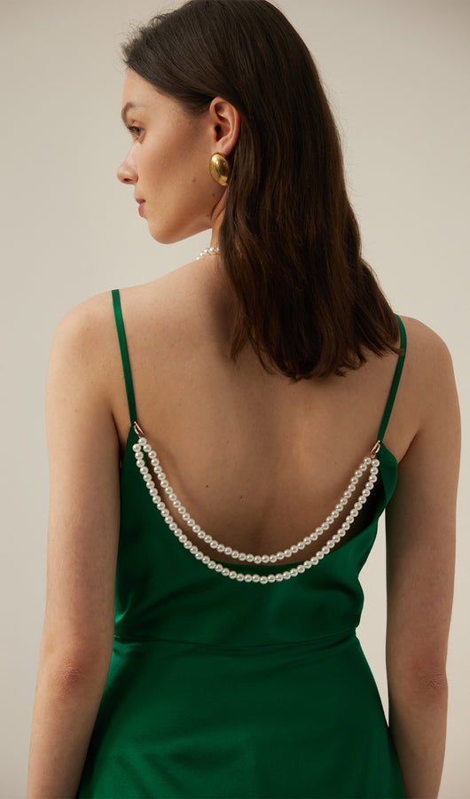 Crafted from Heavy Luxe Matte silk with a lined bodice, this dress features a V-neckline and a detachable string of freshwater pearls adorning the back. The design is structured with a fitted waist that opens to a flowing skirt.