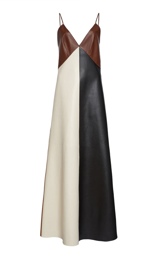Crafted from nappa leather in a lingerie silhouette, this long sleeveless dress features a four-color patchwork. A statement evening dress, this piece taps into the season's color-block effect.
