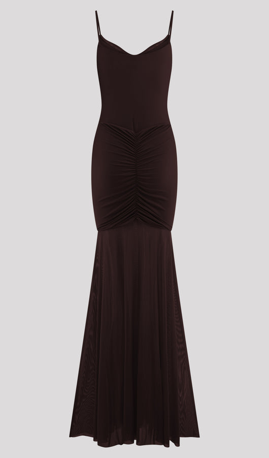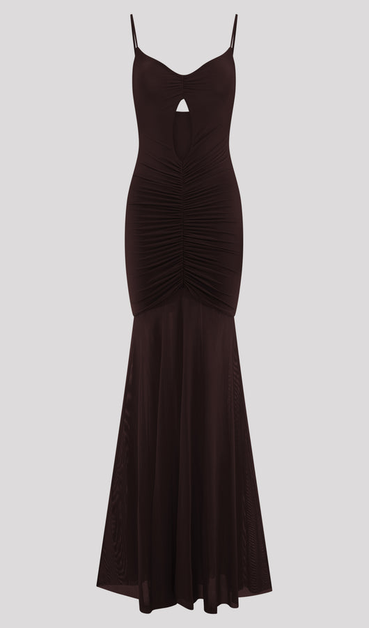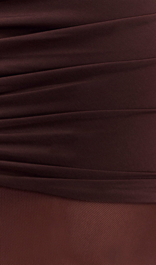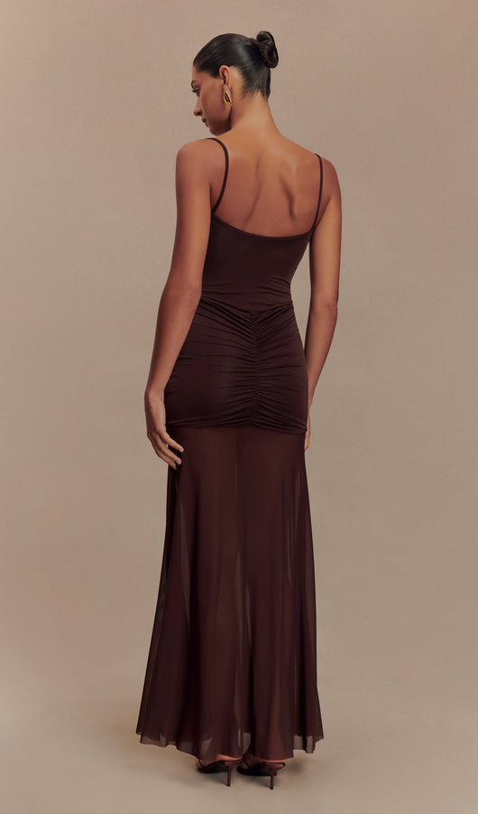 Slinky And Mesh Maxi Dress In Chocolate